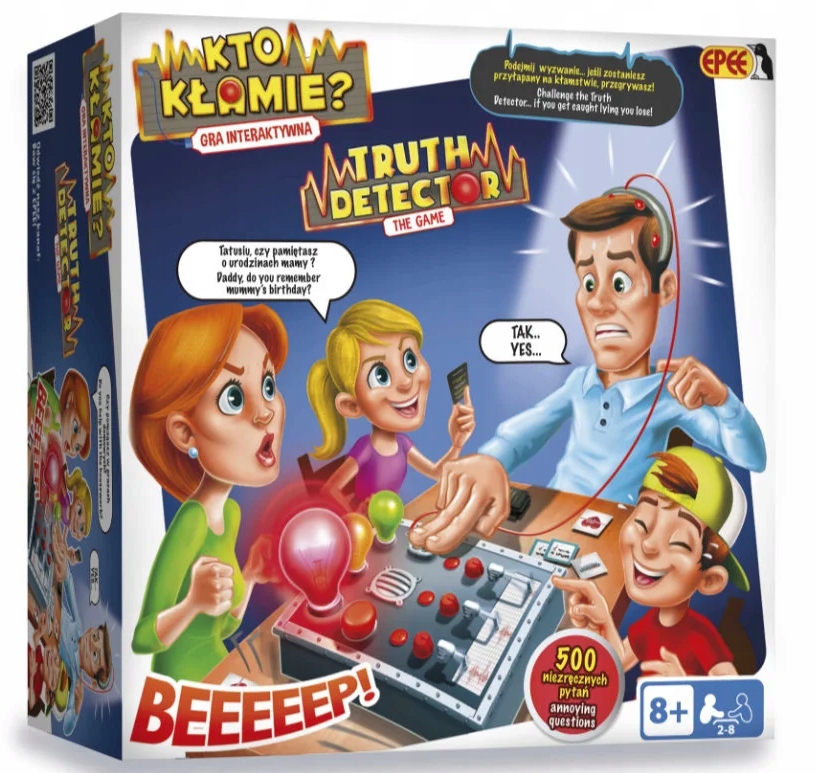 В игре предлагается целых 500 вопросы , благодаря которым вы раскроете секреты своих оппонентов. Если они врут, автомат даст вам знать, но если он не уверен и мигает желтым, нужно задать вопрос еще раз. Когда детектор обнаруживает, что кто-то лжет, раздается звуковая сирена.