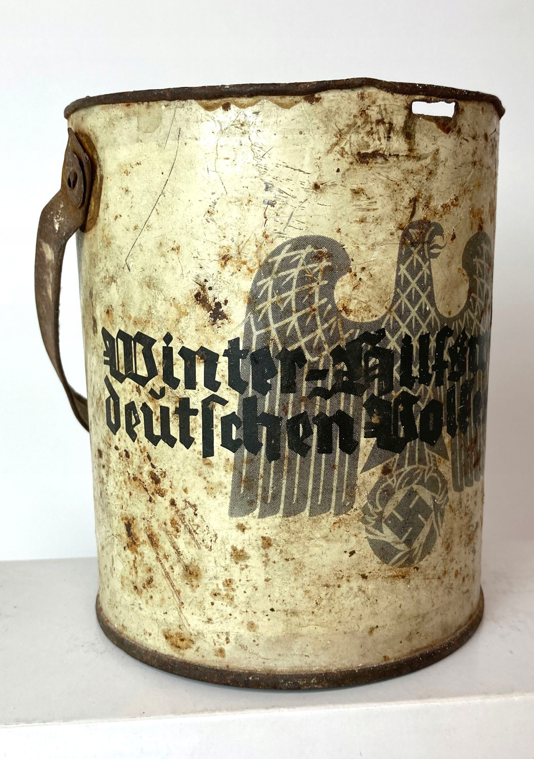 Metal Piggy Bank с ручкой для сбора платежей на WHW. Белая, видимая эмблема с орлом и чернокожим Winterhilfswerk des Deutschen Volkes 1935/1936. Недостаток возраста.
