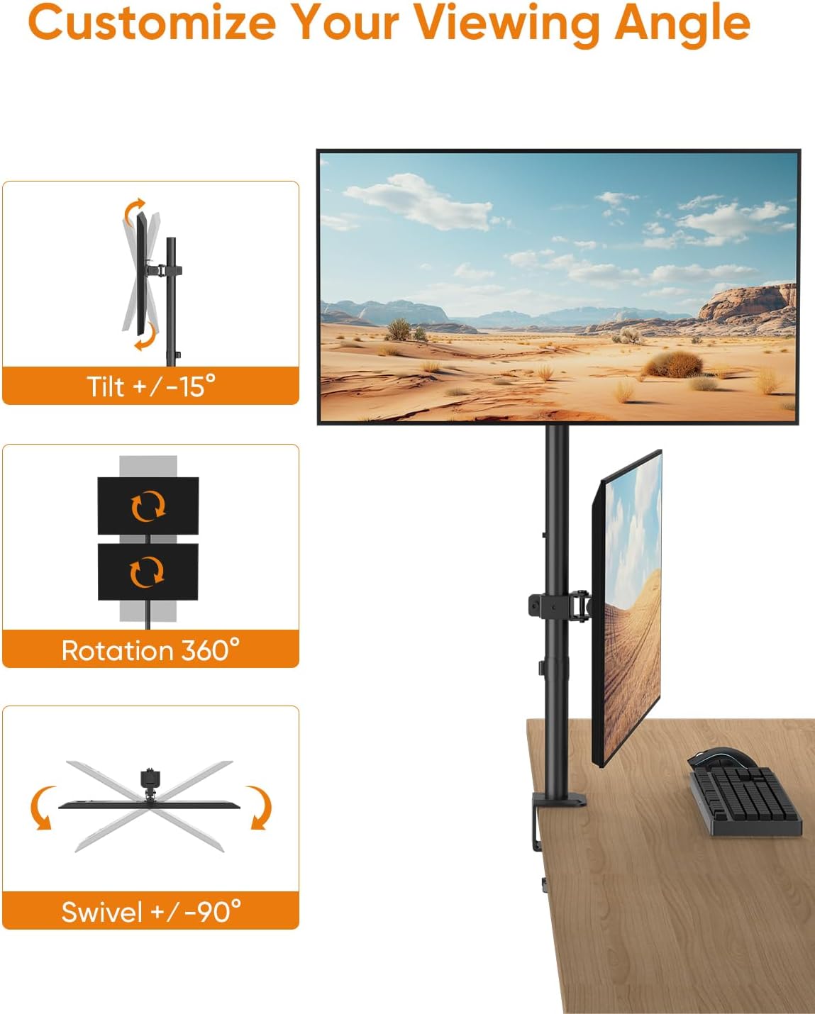 Полное движение: каждая головка ручки монитора полностью и независимо регулируется. Все суставы могут быть повернуты на ± 90 °. Наш держатель двойного монитора имеет наклон +/- 15 ° вверх и вниз, чтобы уменьшить отражатели, оборот на 180 ° и оборот на 360 °, что позволяет устанавливать мониторы под оптимальным углом для максимального комфорта и эффективности.