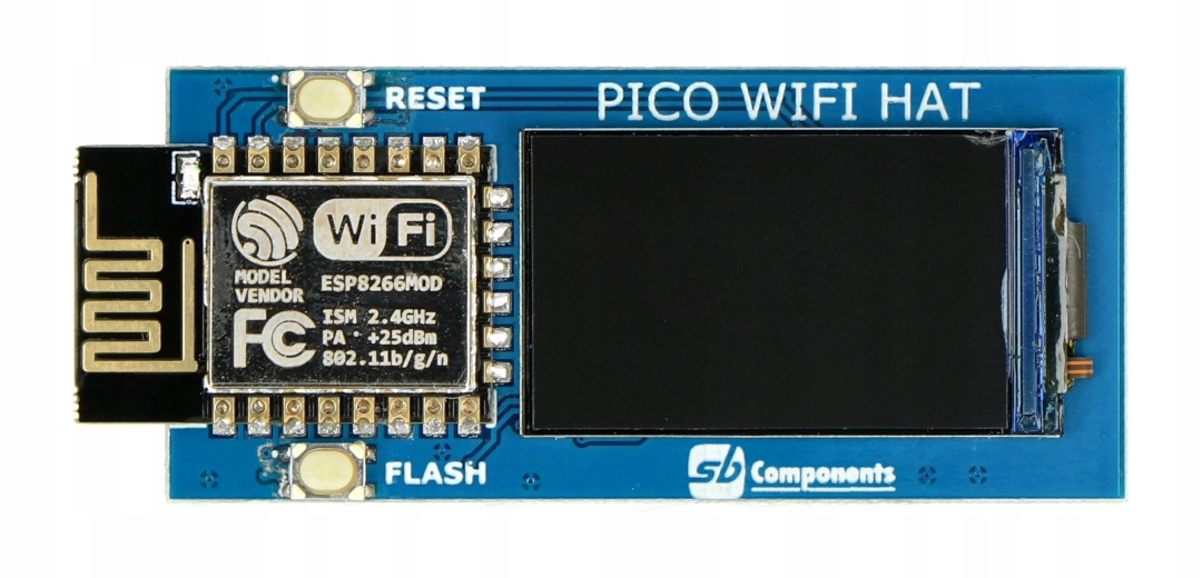 наложение, созданное компонентами SB, позволяет расширить модуль Raspberry Pi Pico с беспроводной связью WiFi IEEE 802.11 B/G/N , через систему ESP8266 Полем Система может быть запрограммирована с помощью команд, поддерживает протокол связи TCP/UDP. Наложение также оснащено небольшим ЖК -экраном с диагоналем 1,14 дюйма и разрешением 240 x 135 пк, на котором отображается 65 К цветов в цветовой палитре RGB. Экран основан на ST7789 , для связи использует интерфейс сна