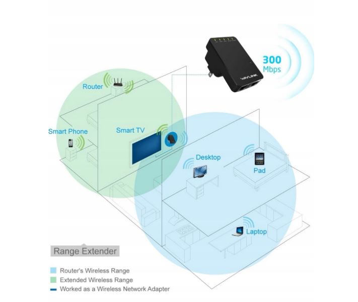 Репитер принимает сигнал Wi-Fi переднего беспроводного маршрутизатора, расширяет новый Wi-Fi и значительно расширяет зону действия беспроводной сети, чтобы решить проблему неполного покрытия сигнала Wi-Fi маршрутизатора и прерывистых сигналов в спальне, на балконе и в ванной комнате.