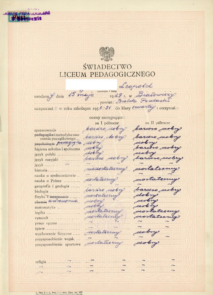 ŚWIADECTWO LICEUM PEDAGOGICZNEGO - GŁOGÓWEK