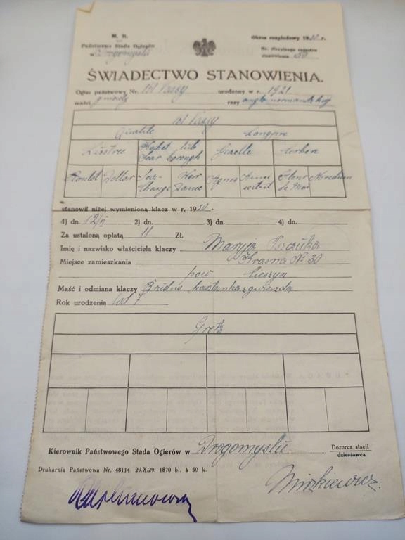 Świadectwo Stanowienia – Państwowe Stado Ogierów, Drogomyśl, 1930 r.