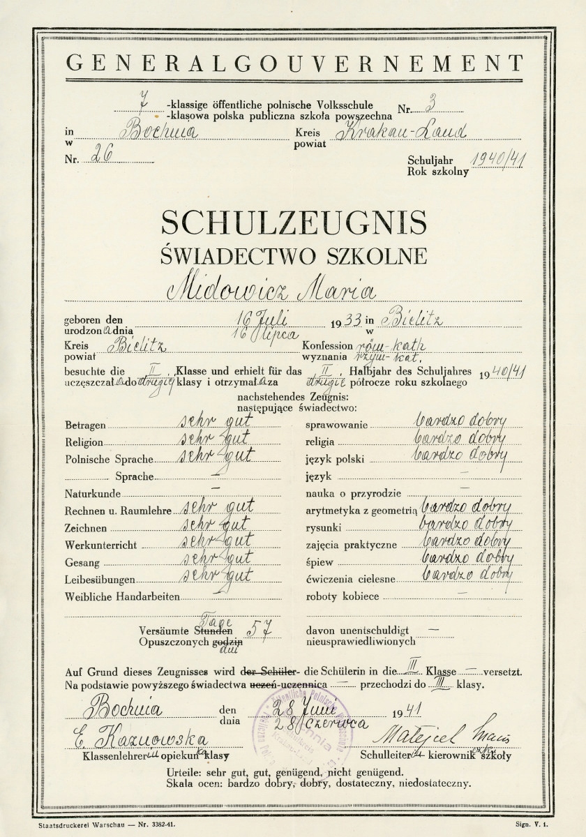 ŚWIADECTWO SZKOLNE GENERALGOUVERNEMENT BOCHNIA KRAKÓW 1941