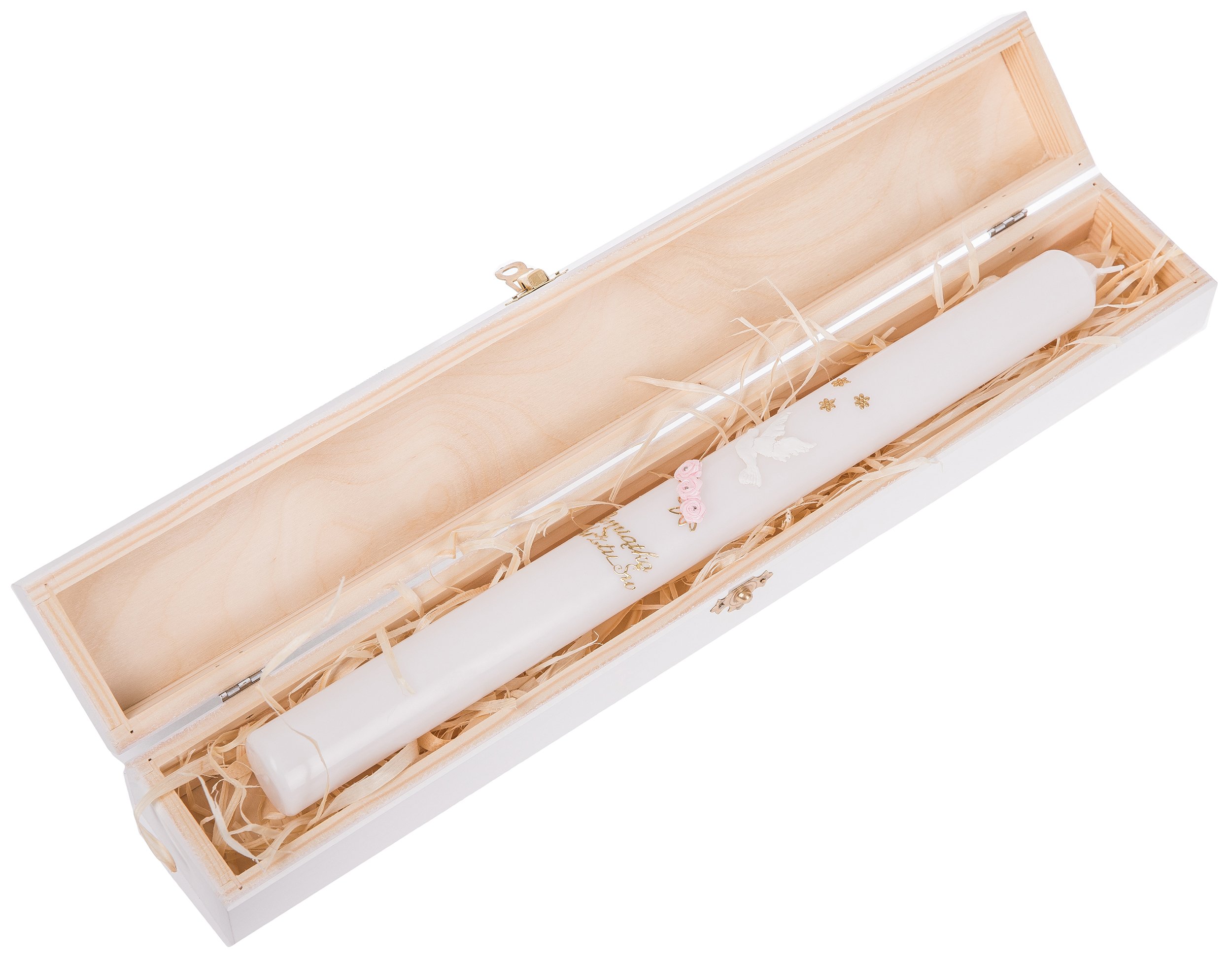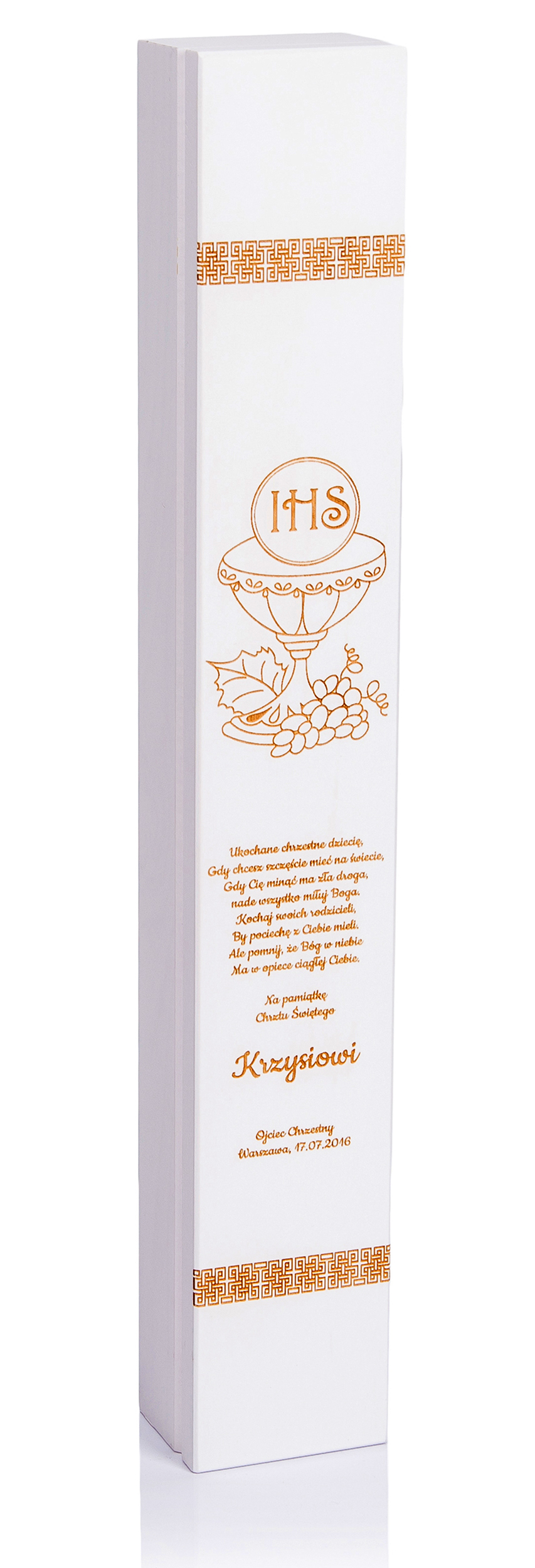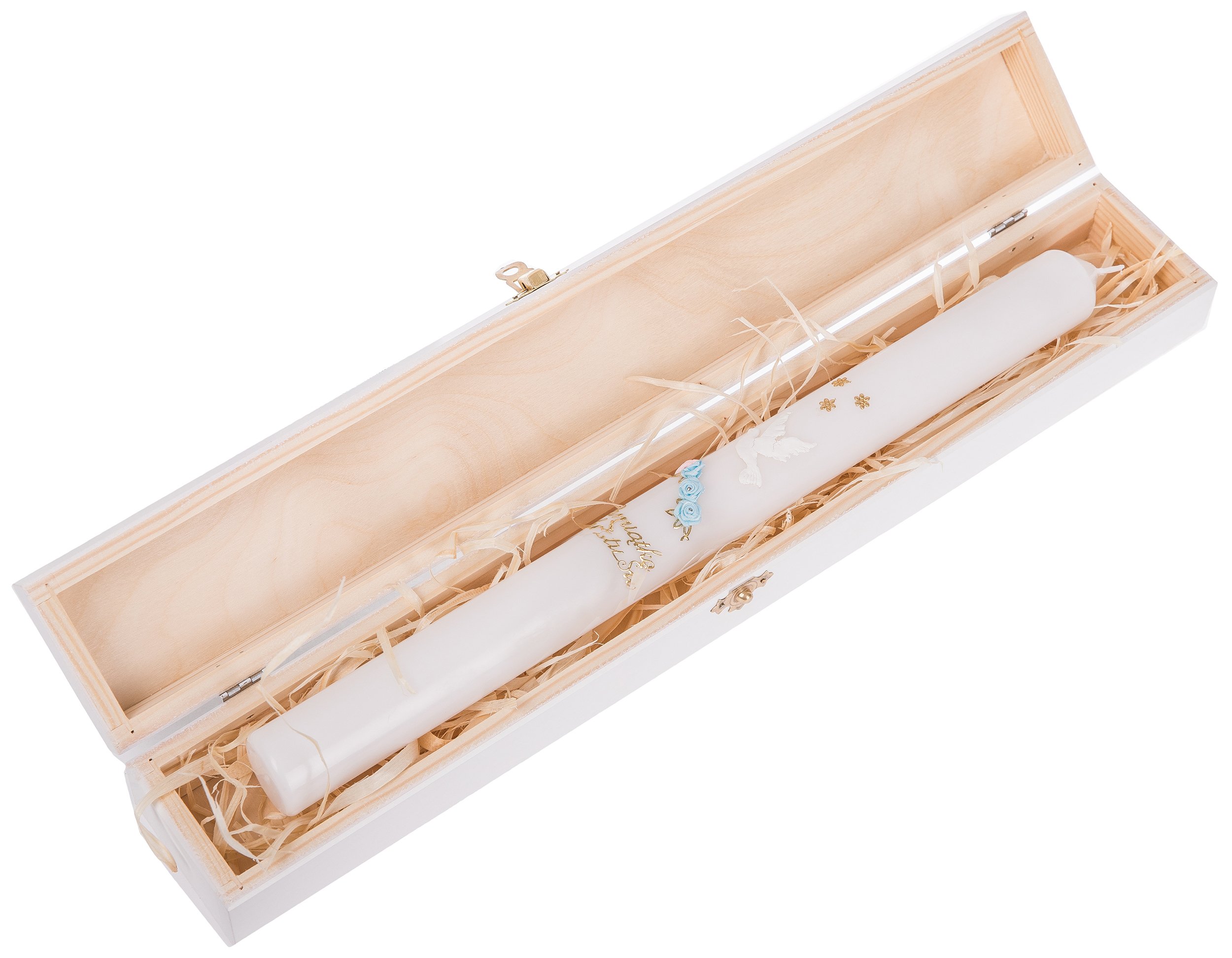 ŚWIECA DO CHRZTU W DREWNIANYM PUDEŁKU GRAWER
