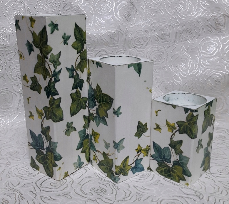 Продаю набор из трех подсвечников из дерева, декорированных методом декупаж с потертостями - потертость (три свечи в комплекте).