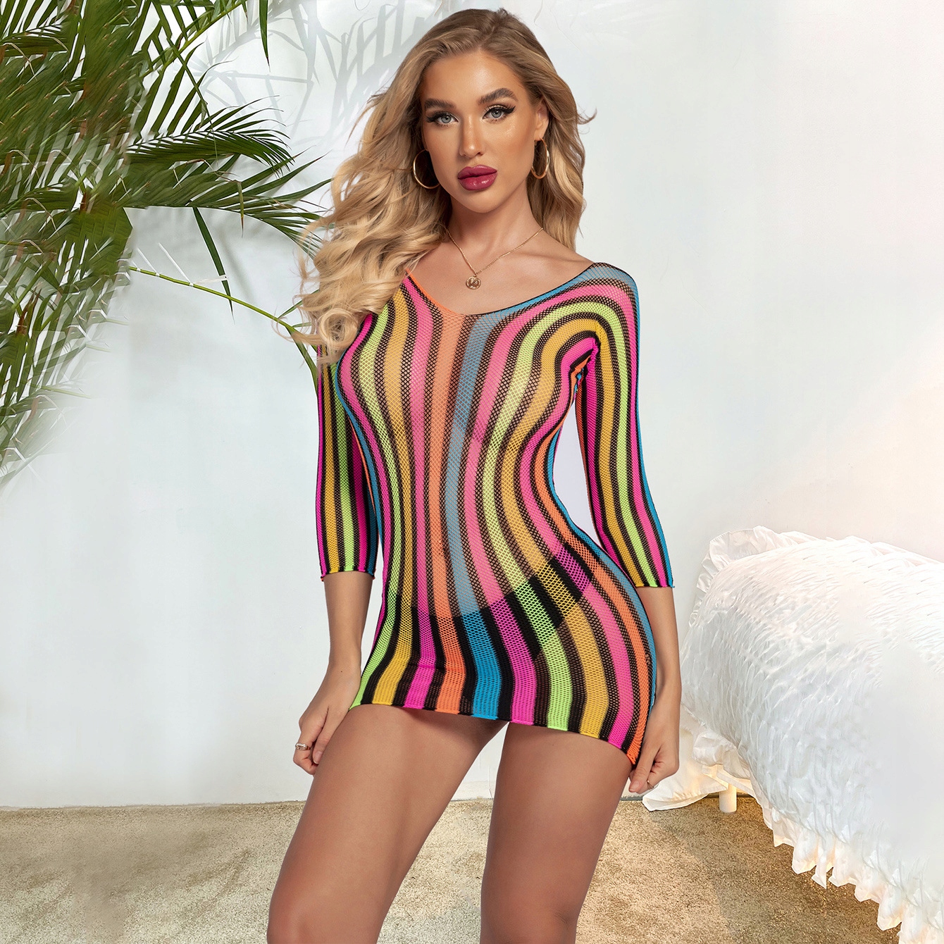 Это мини-платье в разноцветную полоску с длинными рукавами — настоящее проявление модного творчества и смелости. Это платье, выполненное из легкого и очень прозрачного материала, станет идеальным выбором для моментов, когда вы хотите выразить свою индивидуальность и чувственность.