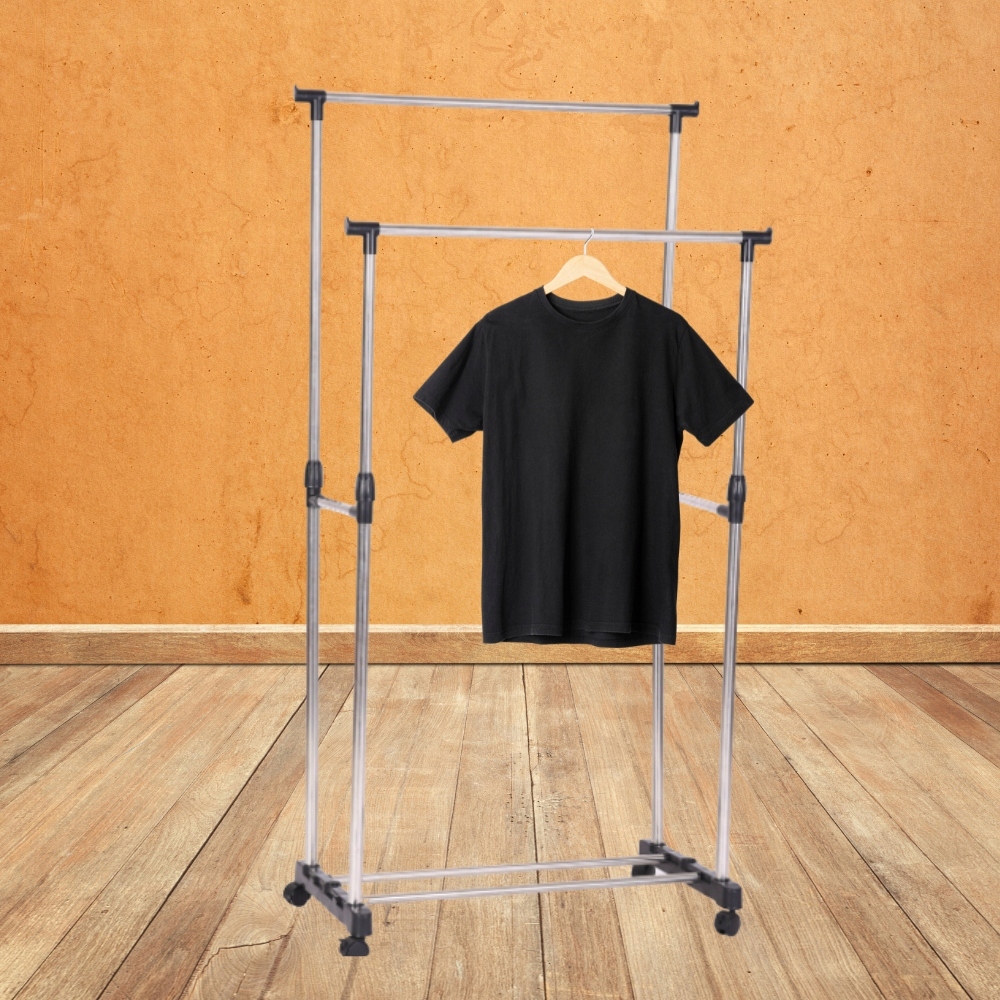 ВЕШАЛКА ДВОЙНАЯ, ОДЕЖДА СТОИТ НА КОЛЕСАХ