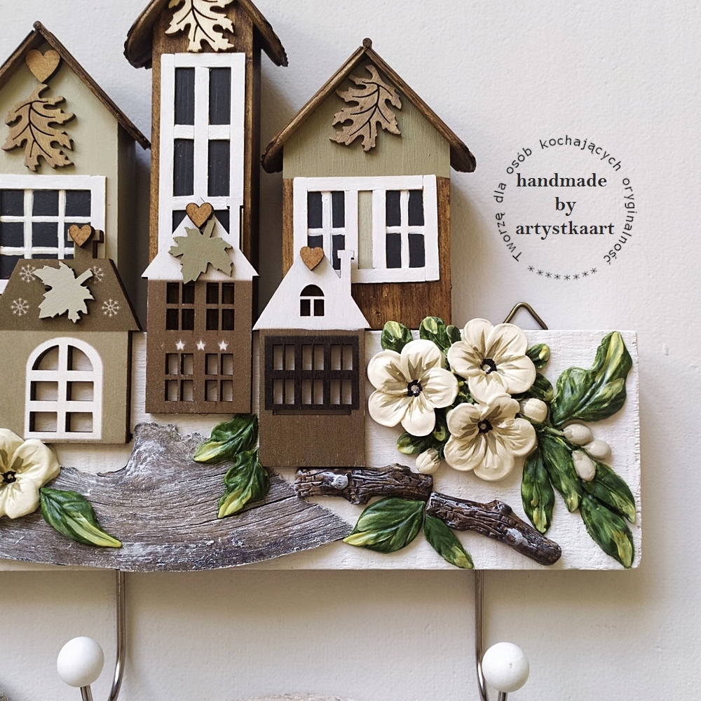 WIESZAK rękodzieło DOMKI uniwersalny 3 wieszaczki 36cm x 26cm