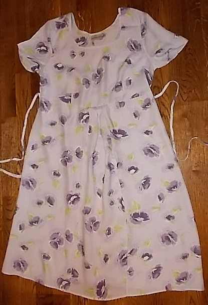 Отличное платье для беременных и для повседневной носки, выполнено из очень качественного тонкого вискозного хлопка с фиолетово-зеленоватым цветочным узором на светло-голубом фоне. Полукруглый вырез. Под грудью отрезной подол, расширенный складками посередине. Перед слегка удлинен, чтобы платье не поднималось на растущий живот. Бретели в боковых швах завязываются сзади. Короткие рукава. Платье в +очень хорошем состоянии - великолепно!!, выглядит великолепно и фото не передает его истинного очарования!!!! НАСТОЯТЕЛЬНО РЕКОМЕНДУЮ!!!!