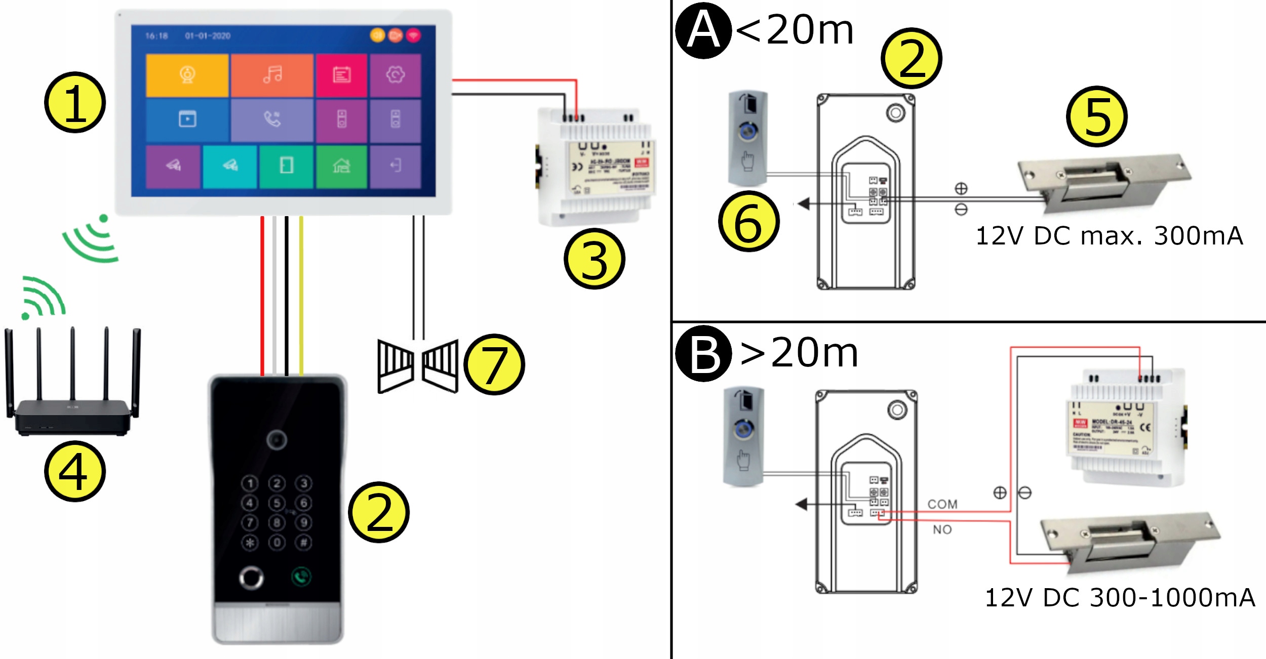 B - Подключение электрозащёлки при расстоянии между внешней панелью и монитором более 20 метров.