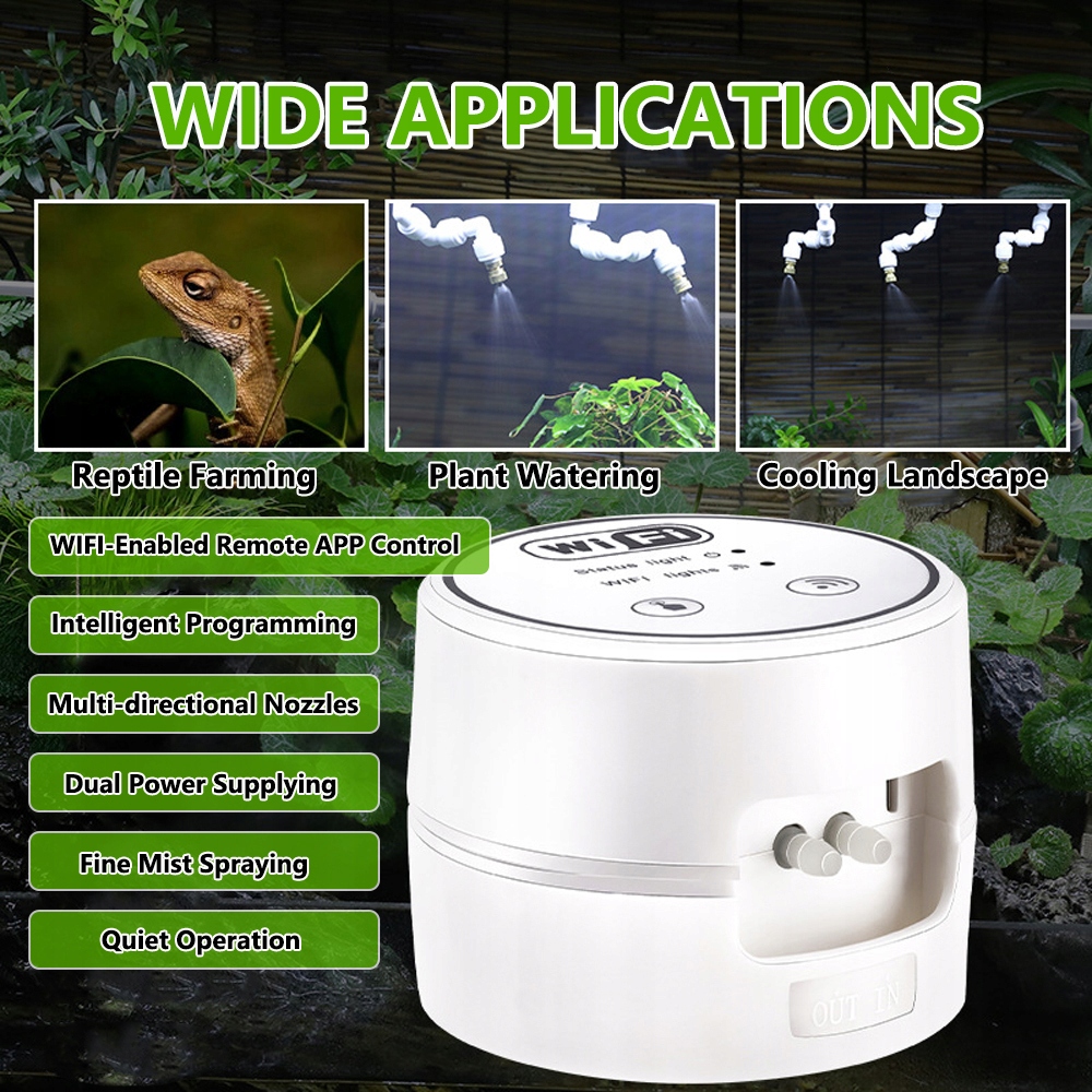5. 【Тихая работа и широкое применение】: система, разработанная с использованием технологии шумоподавления, работает бесшумно, сводя к минимуму нарушение окружающей среды. Его прочная конструкция обеспечивает долговечность даже при постоянном использовании, что делает его пригодным для различных применений, таких как вольеры для рептилий, питомники растений и системы охлаждения ландшафта.