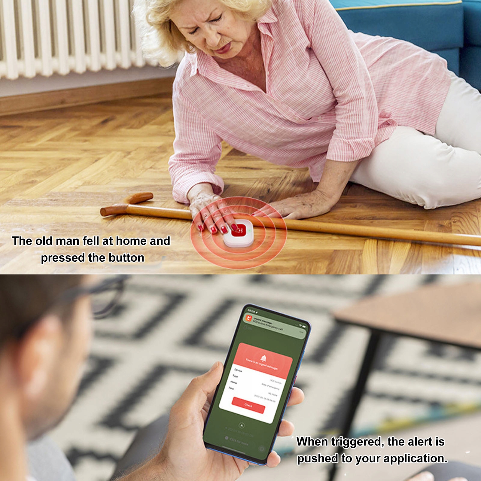 1. Беспроводное подключение к Wi-Fi: поставляется с интеллектуальной кнопкой вызова SOS, которая подключается к домашней сети Wi-Fi и может быть добавлена в приложение для смартфона. 2. Быстрое уведомление: если пожилому человеку нужна помощь, просто нажмите кнопку вызова. Вам будет отправлено быстрое уведомление, чтобы вы могли немедленно получить помощь. (Примечание: расстояние между кнопкой вызова и Wi-Fi не должно превышать 32,8 фута) 3. Мониторинг батареи: когда кнопка SOS подключена к мобильному приложению через Wi-Fi 2,4 ГГц, уровень заряда батареи передатчика можно проверить в Приложение, обеспечивающее своевременные напоминания о необходимости подзарядки и предотвращающее потенциальные аварийные ситуации из-за потери питания. 4. Диапазон и совместимость: кнопка экстренного вызова имеет дальность передачи до 32,8 футов по Wi-Fi и может использоваться в различных местах, таких как дома, больницы и дома престарелых. 5. Простая система оповещения: просто аккуратно нажмите кнопку подключения Wi-Fi, и лица, осуществляющие уход, смогут немедленно получать уведомления. Его конструкция оптимизирует возможности быстрой реакции и правильной работы.
