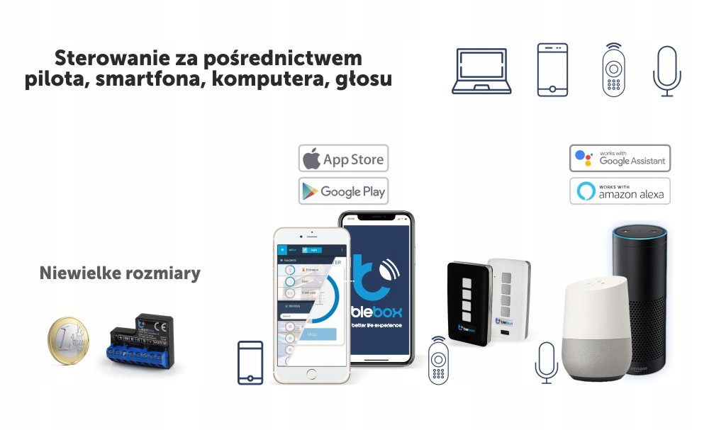Контроллер wBox был разработан компанией BleBox как уникальное решение по глобального масштаба. Для работы контроллерам не требуются дополнительные устройства, такие как центральный блок или концентратор. Все, что вам нужно, это обычная сеть Wi-Fi. Подключив к нему устройства, ими можно будет управлять из любой точки мира. Никакой сложной конфигурации. Вы можете начать с одного контроллера, управляющего лампой или рольставнями, а затем расширить свой собственный «Умный дом», добавляя при необходимости дополнительные контроллеры.