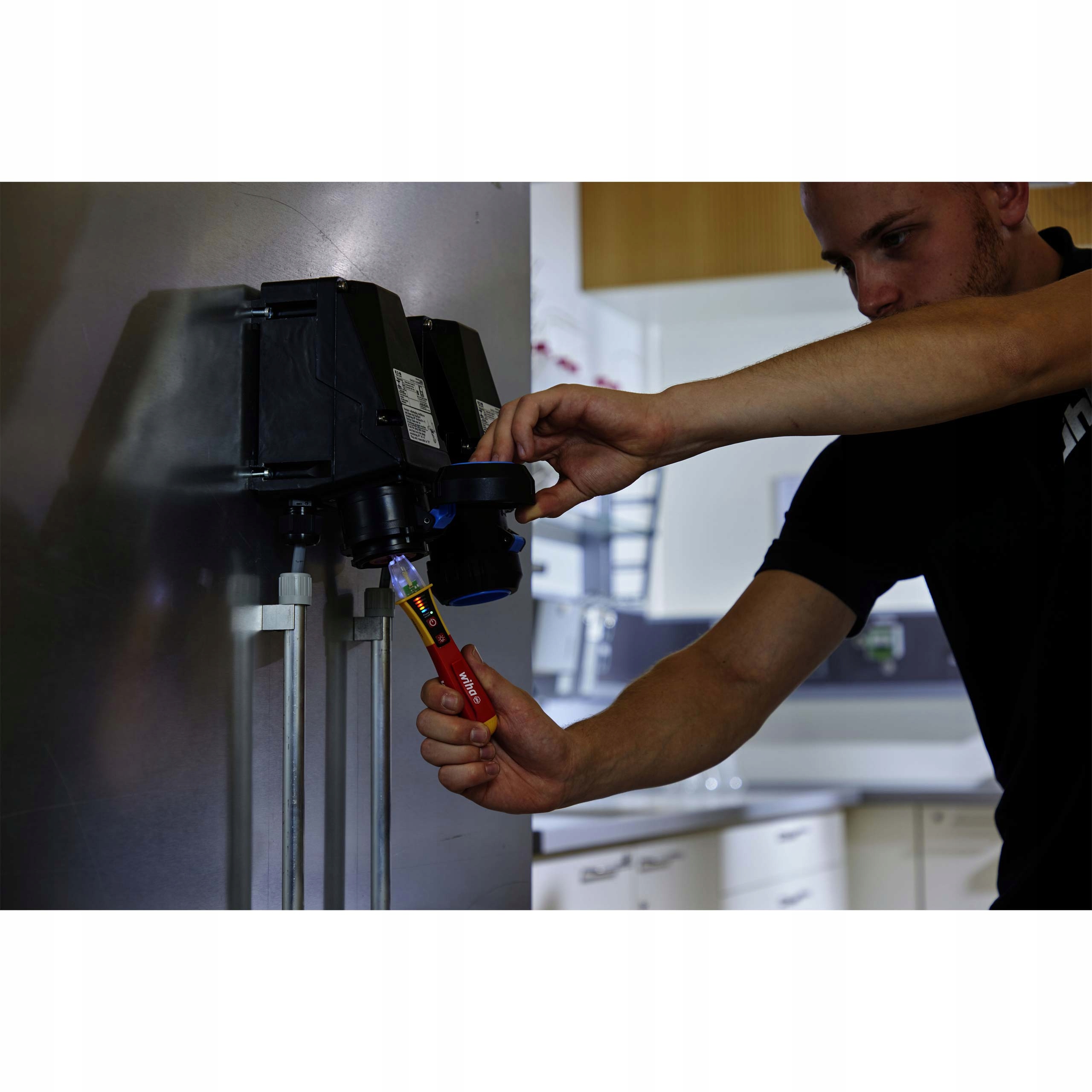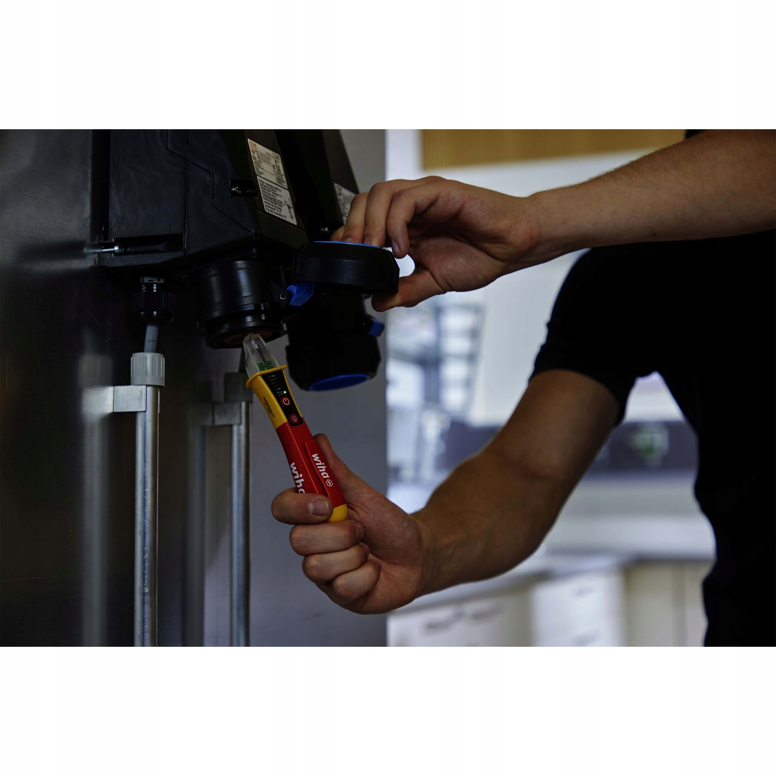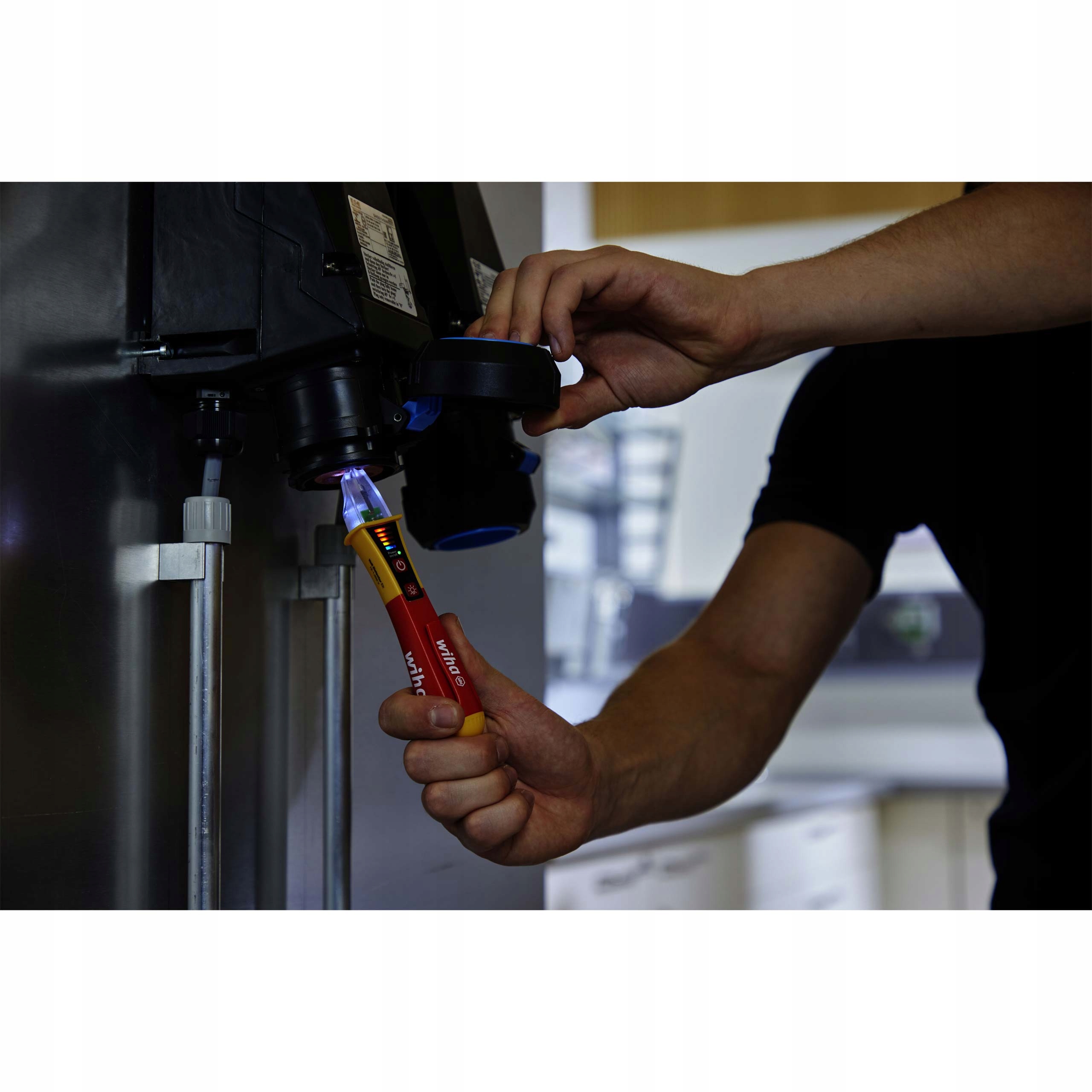 Первая индикация отсутствия напряжения возможна с помощью бесконтактного тестера напряжения Wiha благодаря оптическим и акустическим сигналам.