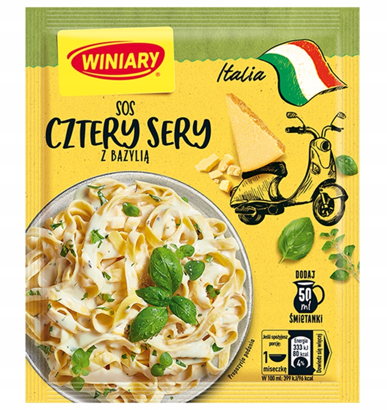 Winiary Italia — четыре сыра с базиликом — это смесь соусов, сочетающая в себе сливочный характер сыров и травяную свежесть базилика. Всего за несколько минут вы приготовите бархатистый соус для макарон, ньокки или запеканок. Просто разложите содержимое пакетика в воде/молоке, вскипятите и перемешайте до однородного состояния. Этот соус идеально покрывает макароны, создавая сытное домашнее блюдо.
