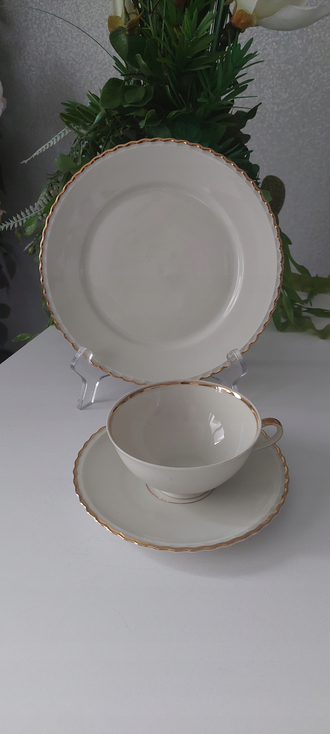 Экрю трио, размеры: высота чашки 5 см, диаметр чаши 10 см, диаметр тарелки для чашки 14 см, диаметр десертной тарелки 19,5 см.