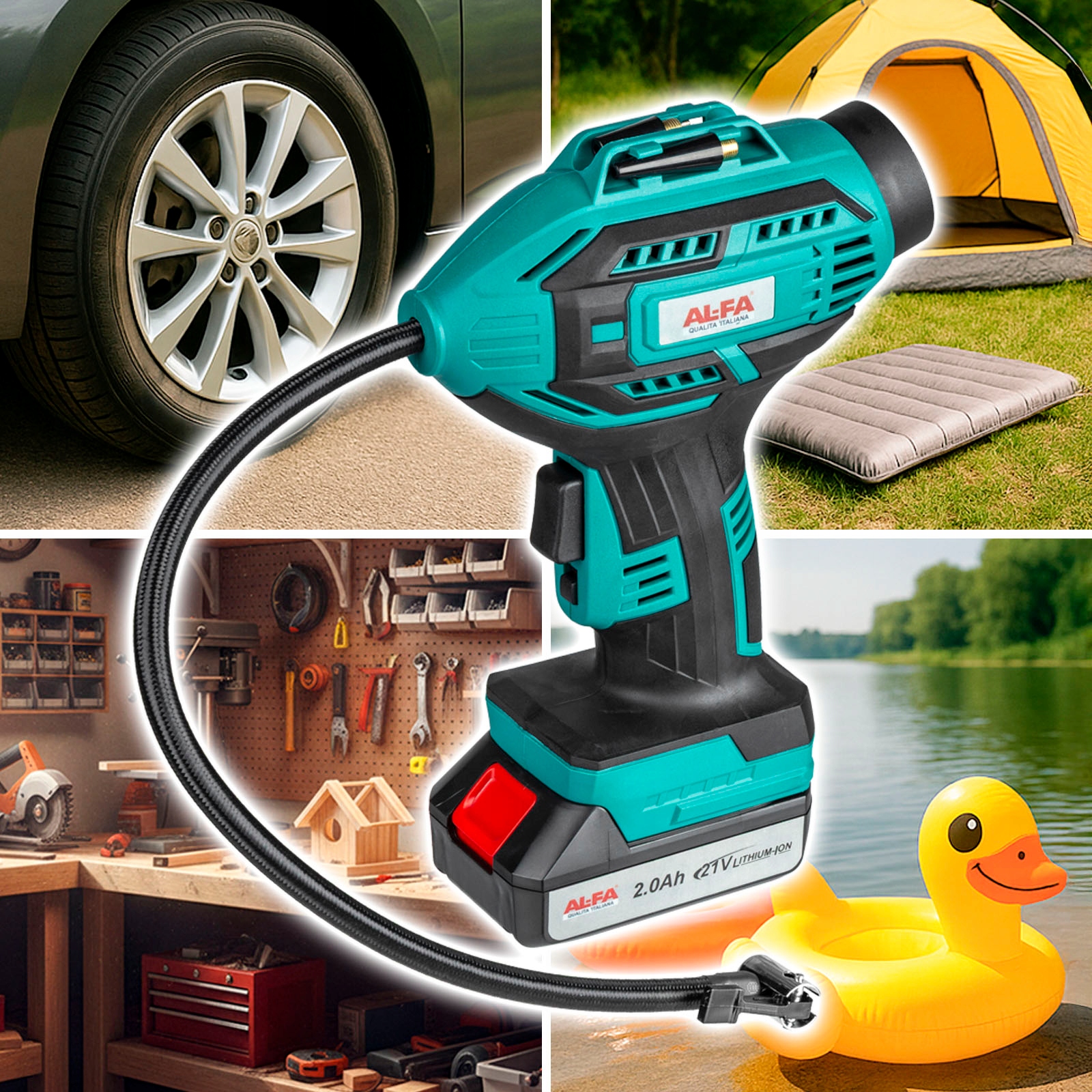 Практичный и мобильный Аккумуляторный компрессор AL-FA ALCAP-21Vнезаменимый инструмент в каждом доме, гараже и багажнике автомобиля. Благодаря эффективному аккумулятору 21 В и компактному дизайну он идеально подходит для повседневного использования, а также во время поездок или экстренных ситуаций.