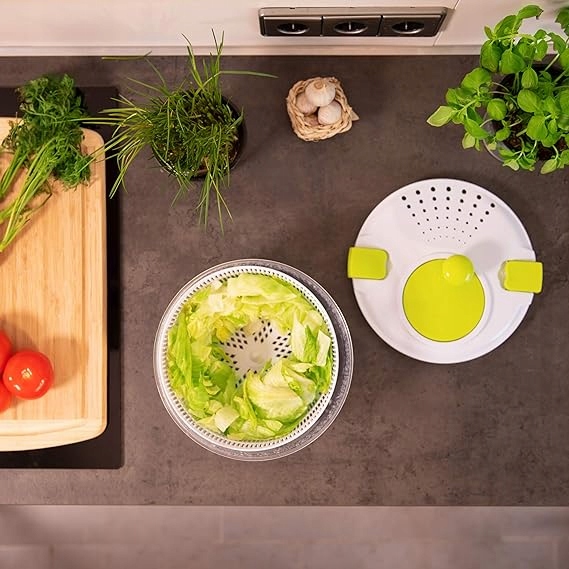 Попрощайтесь с мягкими листьями салата и водянистыми заправками для салата. Просто поверните ручку, и ваш салат превратится из лохмотьев в богатство. Всего за несколько секунд ваш салат будет вымыт, высушен и готов к подаче. Центрифугу также можно использовать для мытья овощей и слива лишней влаги через отверстия в крышке. Крышка оснащена запорным механизмом, который гарантирует, что ничего не выпадет. Ситечко и салатницу легко использовать, их можно мыть в посудомоечной машине.