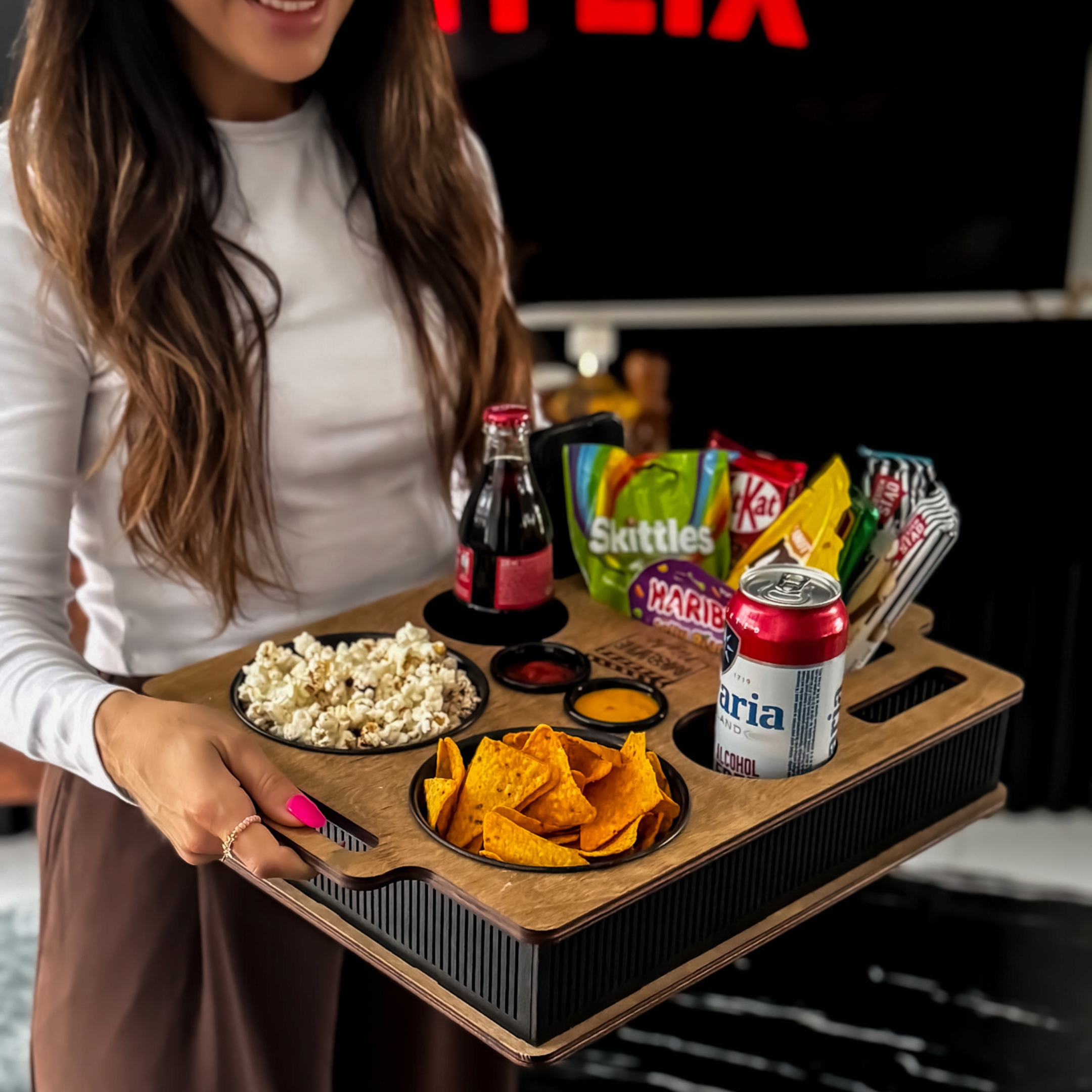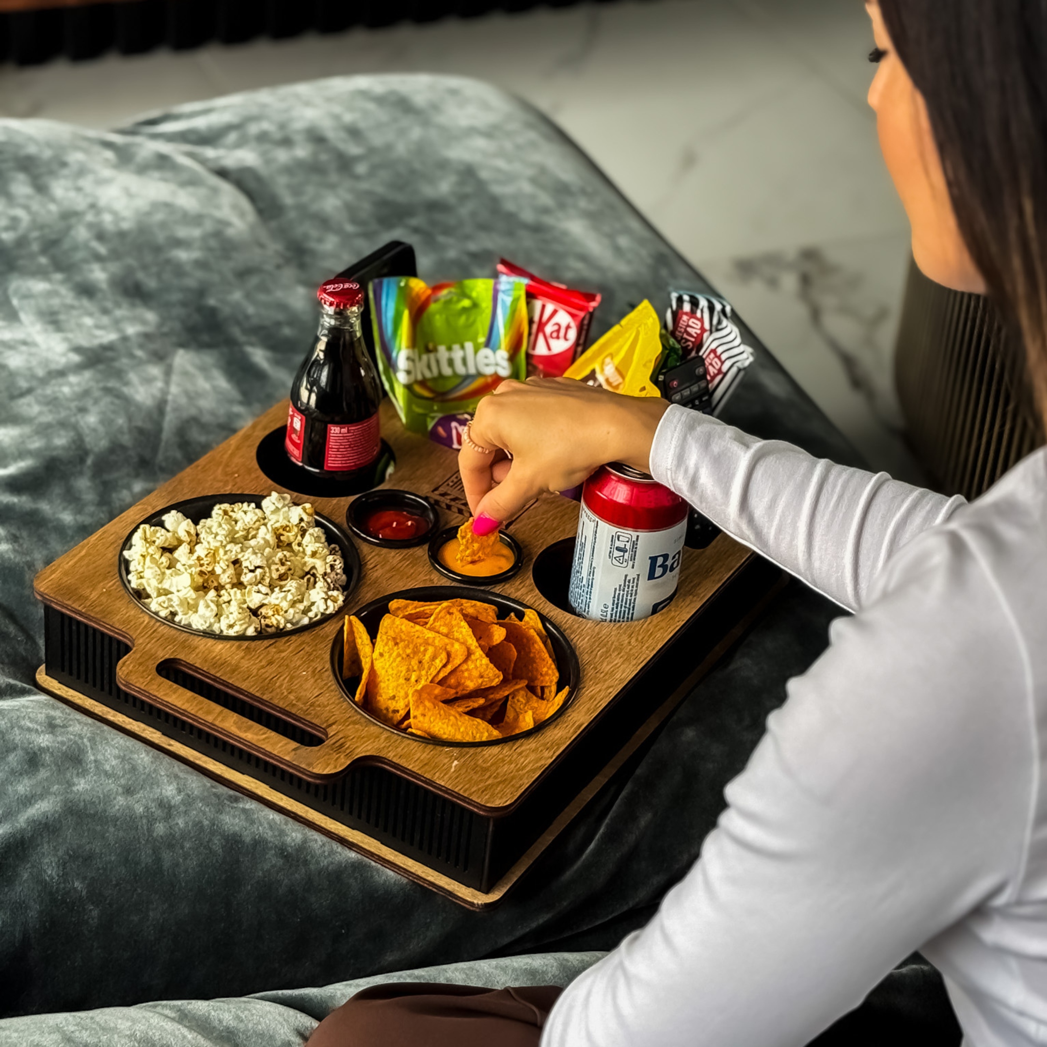 🍿 Все в одном месте - миски, соусы, напитки и телефон всегда под рукой