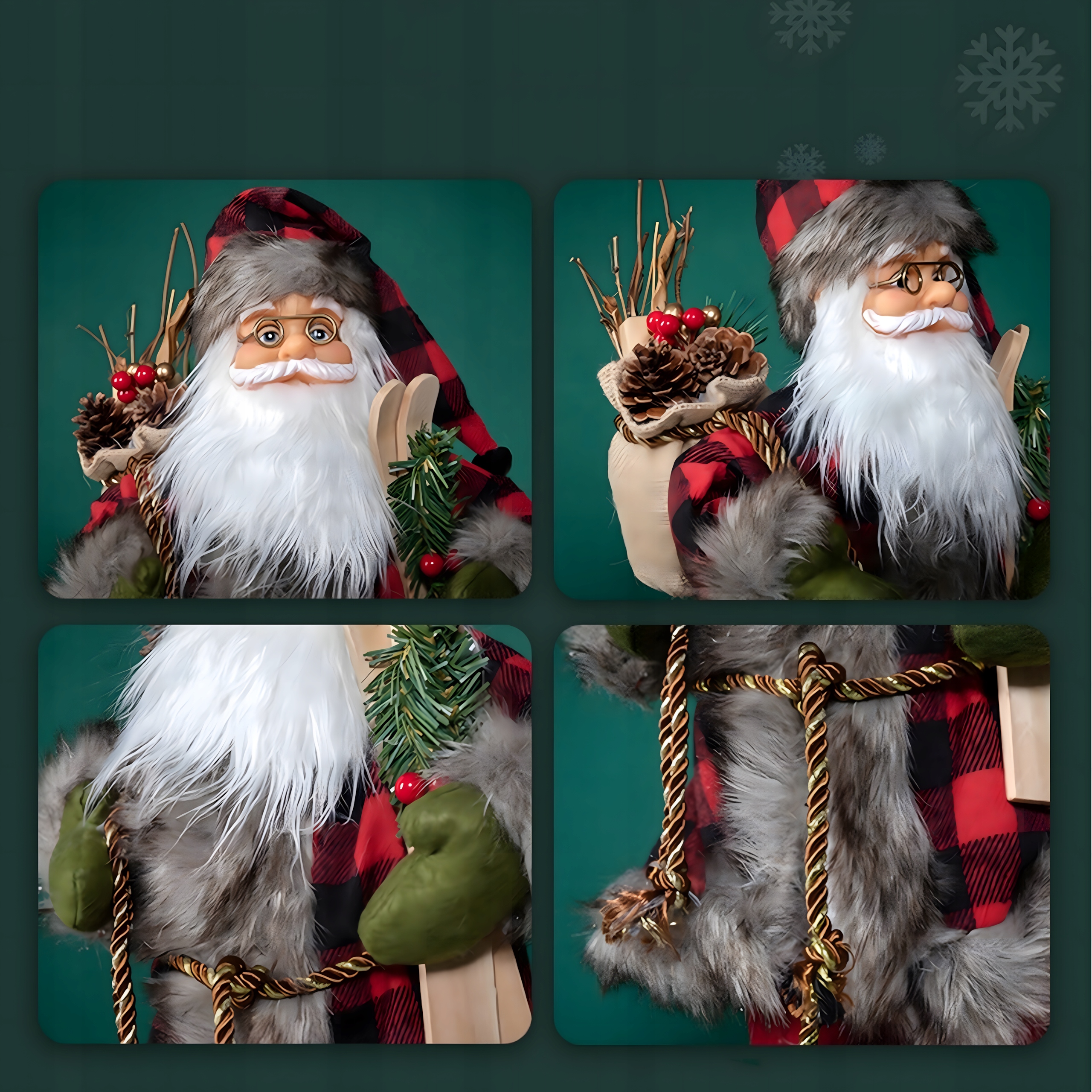 На фигурке Дед Мороз изображен в виде седовласого старика. в очках, в классическом красном наряде с характерными атрибутами, такими как длинная седая борода и подарки. Это очаровательная и узнаваемая фигура, добавляющая очарования интерьеру.