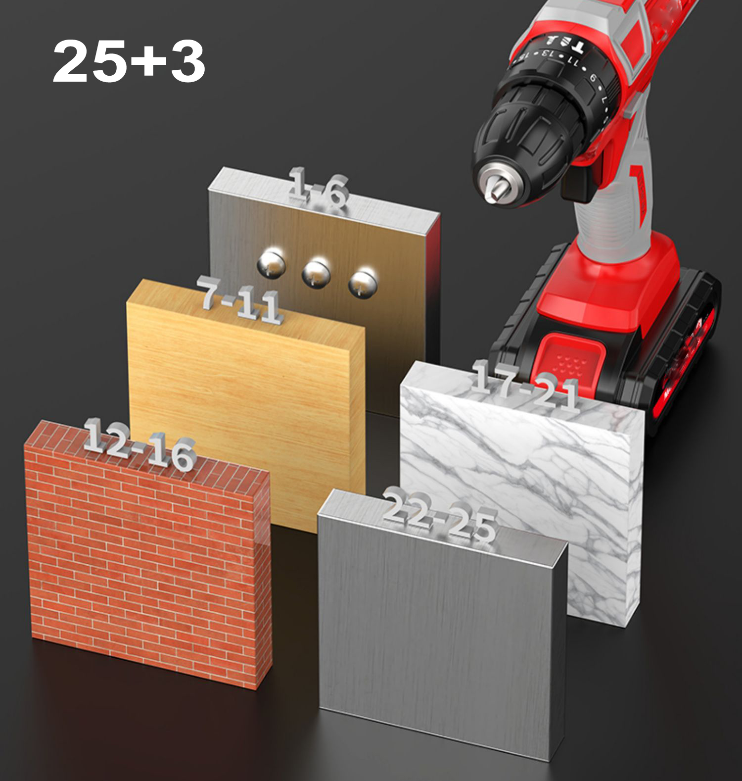 Беспроводная дрель-шуруповерт с 25 рабочими настройками и бесступенчатым регулятором давления (2 скорости: 0–5500 об/мин, 0–11000 об/мин) обеспечивает контроль.