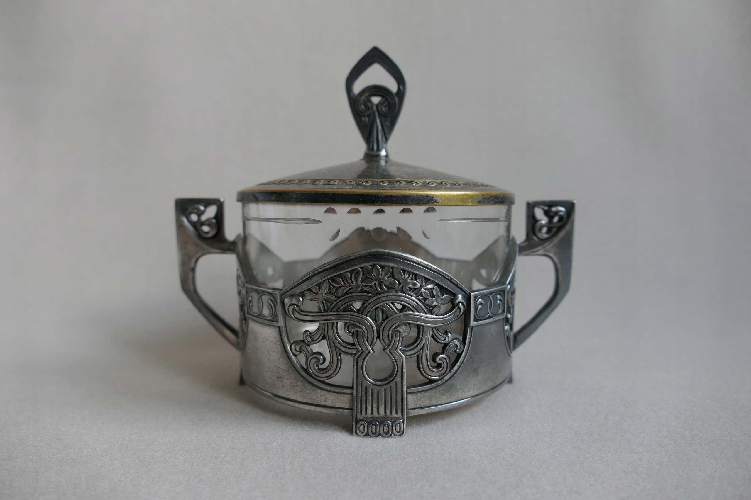 WMF RACOWA SECESJA сахарница из страуса. Диаметр: 8,5 см, высота: 9 см. Стеклянная вставка в очень хорошем состоянии. Состояние видно на фотографиях.