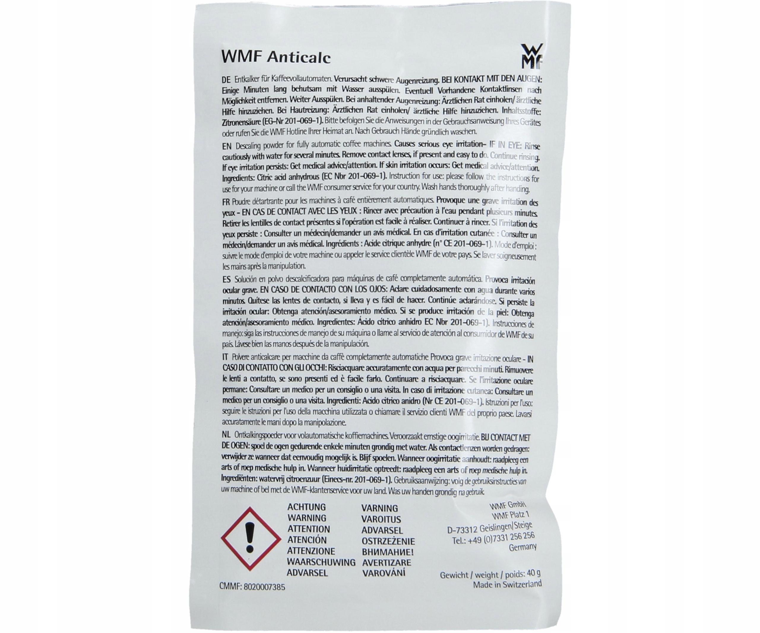 Использование средства для удаления накипи WMF необходимо для правильного ухода за кофемашиной. Средство для удаления накипи гарантирует быстрое и беспроблемное удаление накипи. Прекрасно удаляет известковый налет, скопившийся на деталях. Препарат из серии WMF Perfection WMF сохраняет внутренние элементы кофемашины идеально чистыми. Имеет антибактериальную и дезинфицирующую функцию.