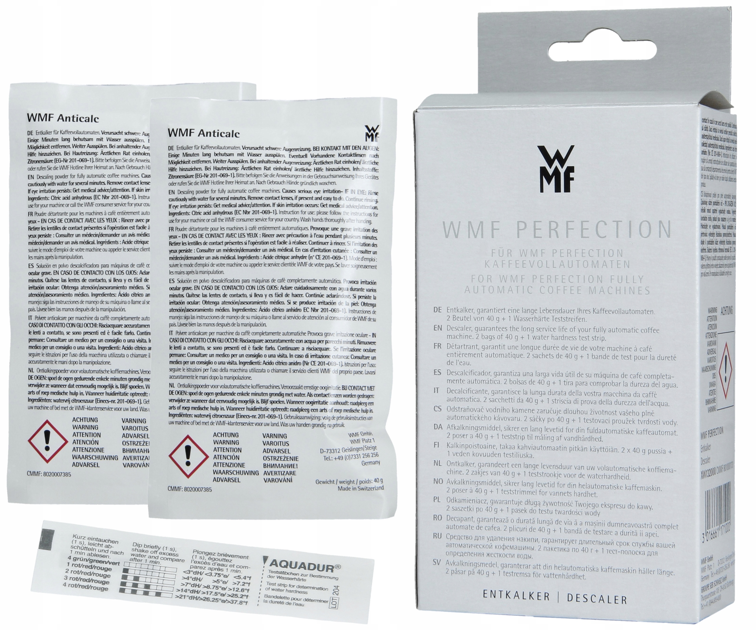 Средство для удаления накипи WMF Perfection для полностью автоматических кофемашин удаляет известковые отложения, которые образуются со временем и требуют удаления. Это позволяет аромату кофе полностью раскрыться – для получения наилучшего наслаждения от кофе в любое время. Набор для удаления накипи состоит из тест-полоски для определения жесткости воды и двух пакетиков для удаления накипи для двух применений и идеального длительного ухода за кофемашиной. Секрет великолепного вкуса кофе: серия WMF Perfection предлагает простые решения, которые помогут вашим кофемашинам раскрыть свой максимальный потенциал.