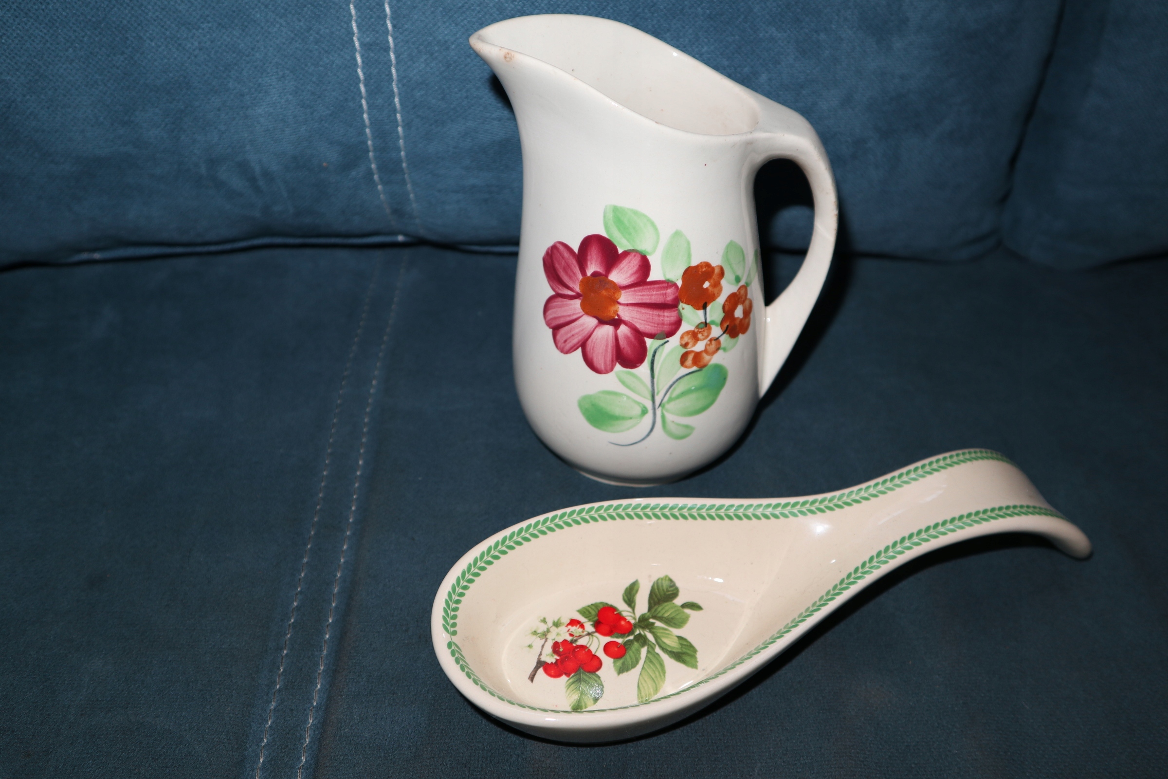 Старый кувшин со старой подписью, 15,5 см, добавляет ложку с возможностью приостановки длиной 23 см. Хорошего аукциона