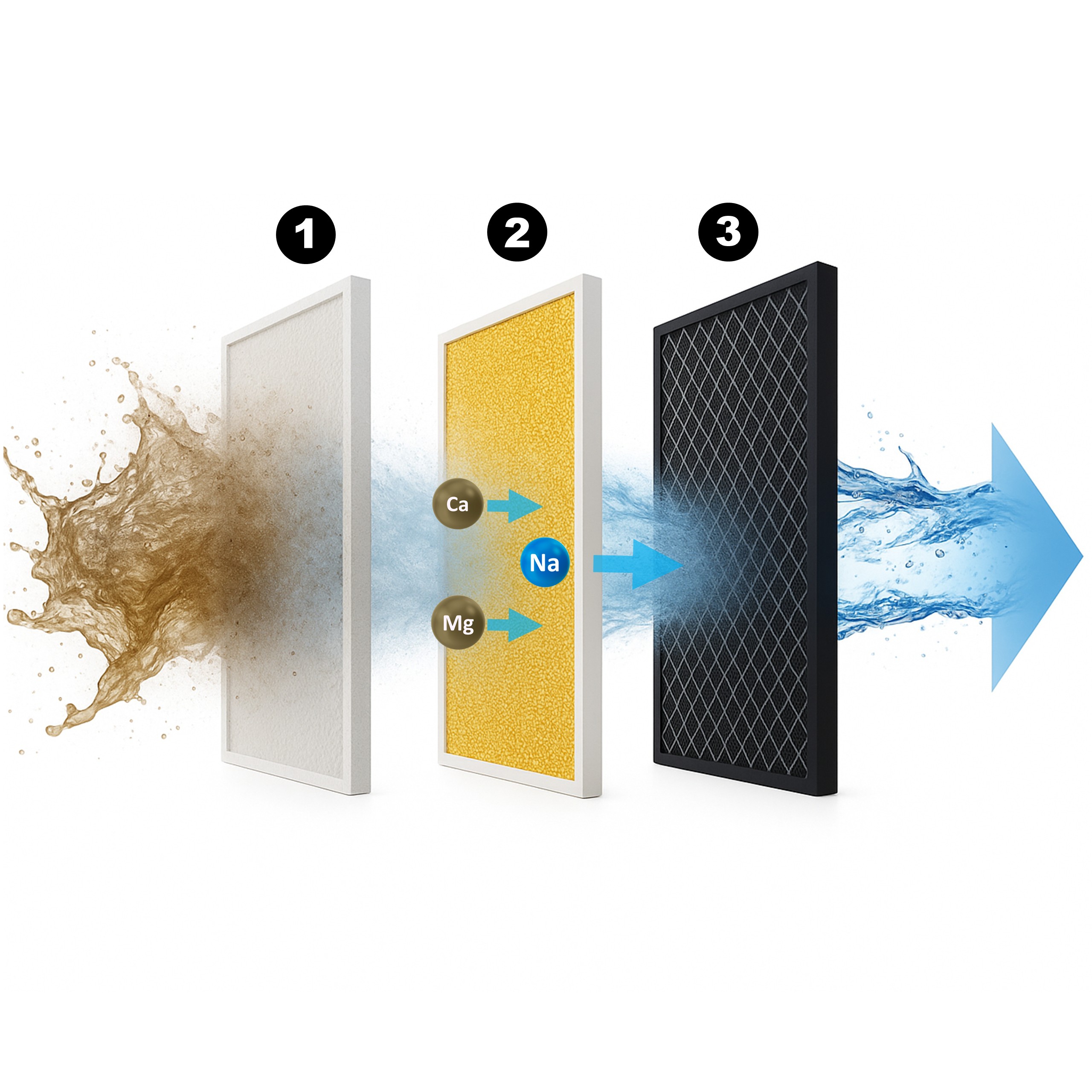 1⃣ Механическая фильтрация: b> Первая стадия фильтрации (FCPS20BB) удаляет более высокое механическое загрязнение (песок, ржавчина, депозиты), что может повредить другим элементам системы и инициально улучшает качество воды.