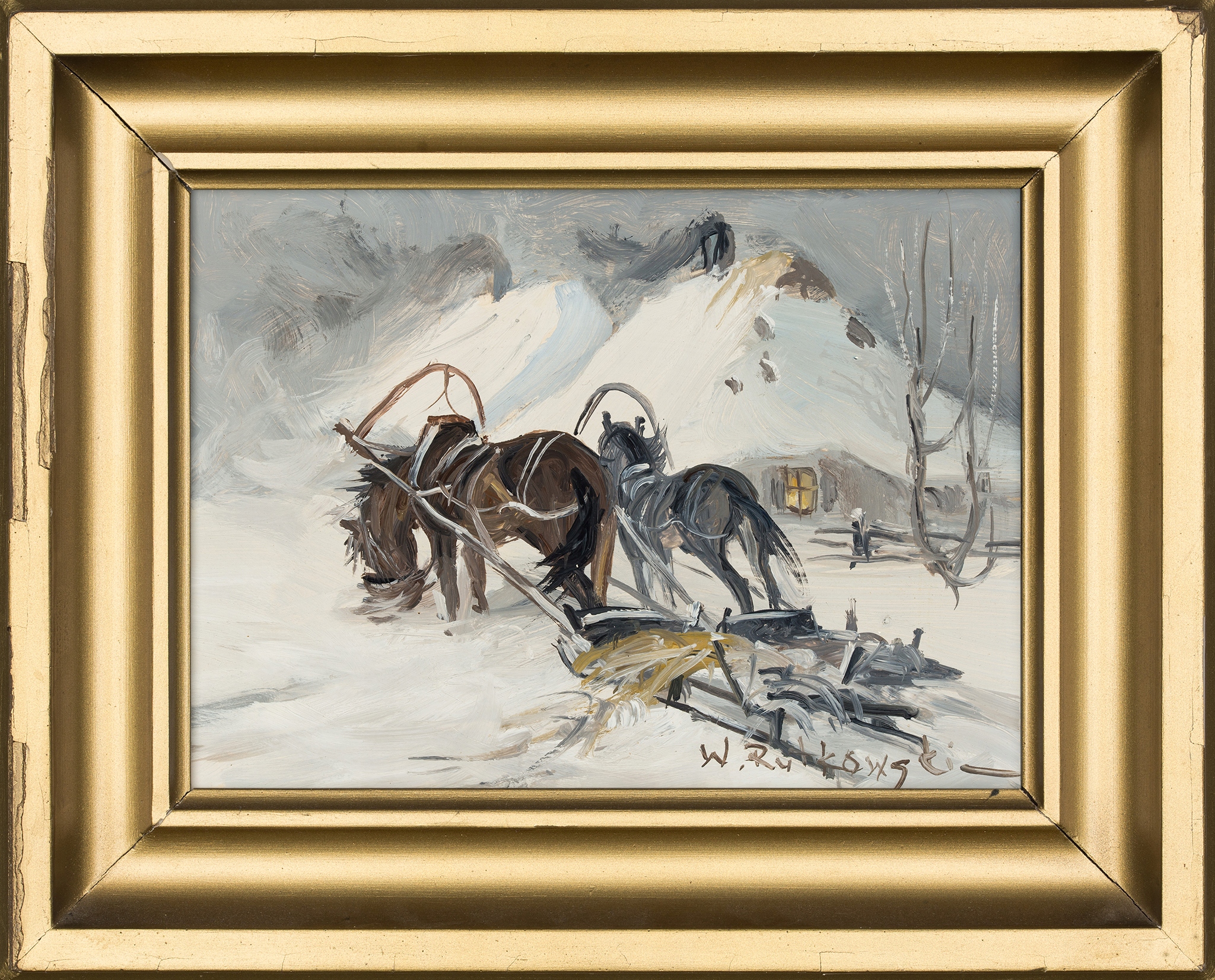 Подлинная картина художника Варшавы, любимого ученика Чеслава Василевски - Влодзимирц Рутковски, изображая зимнюю остановку перед коттеджем. У каждой из лошадей были низкие сани позади них, позиционирование, вероятно, отдыхало в доме. В дополнение к темным силуэтам лошадей, белая аура доминирует. Вся композиция нарисована быстрыми мазками