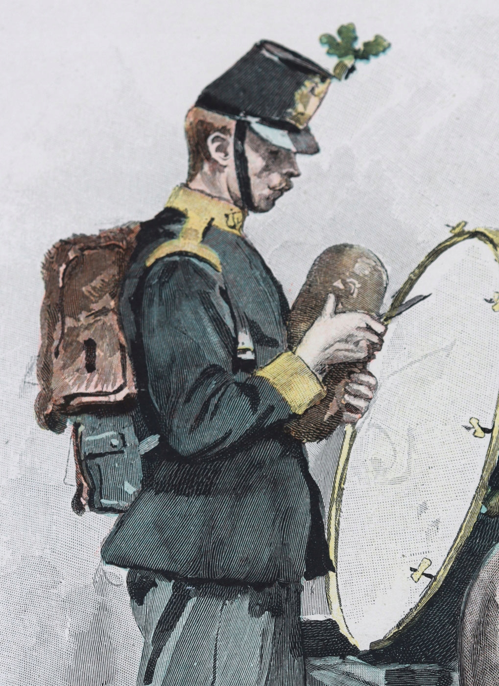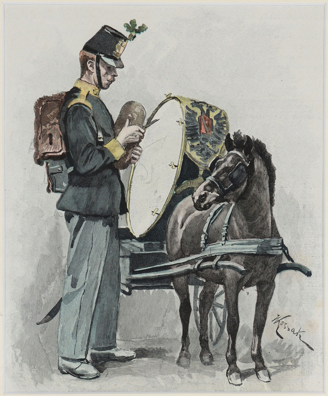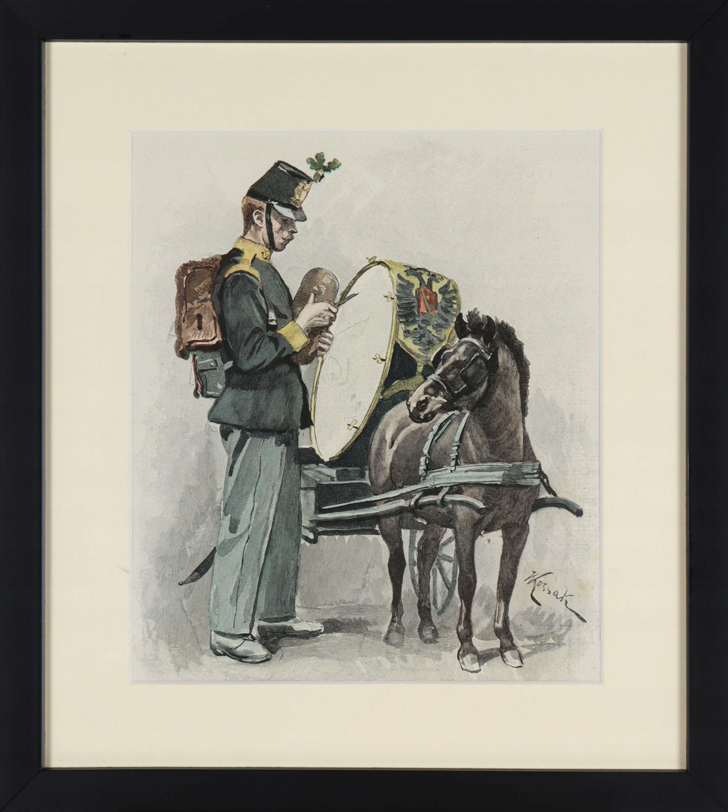 Графика с изображением австрийского солдата с буханкой хлеба и нож в руках. Рядом с ним находится пони с тарабаном в инвалидной коляске.