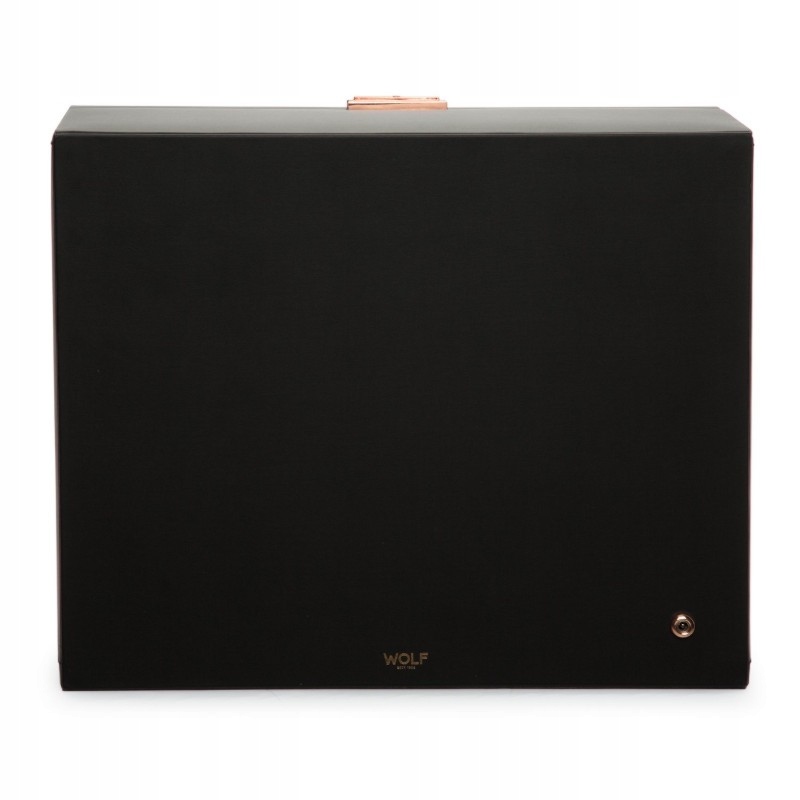 Черный, деревянный, с кожаная обивка, запираемая, металлическая лицевая панель.