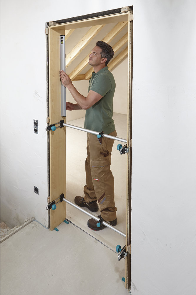 - Обеспечивает параллельное расположение обоих боковых элементов дверной коробки относительно каждого прочее