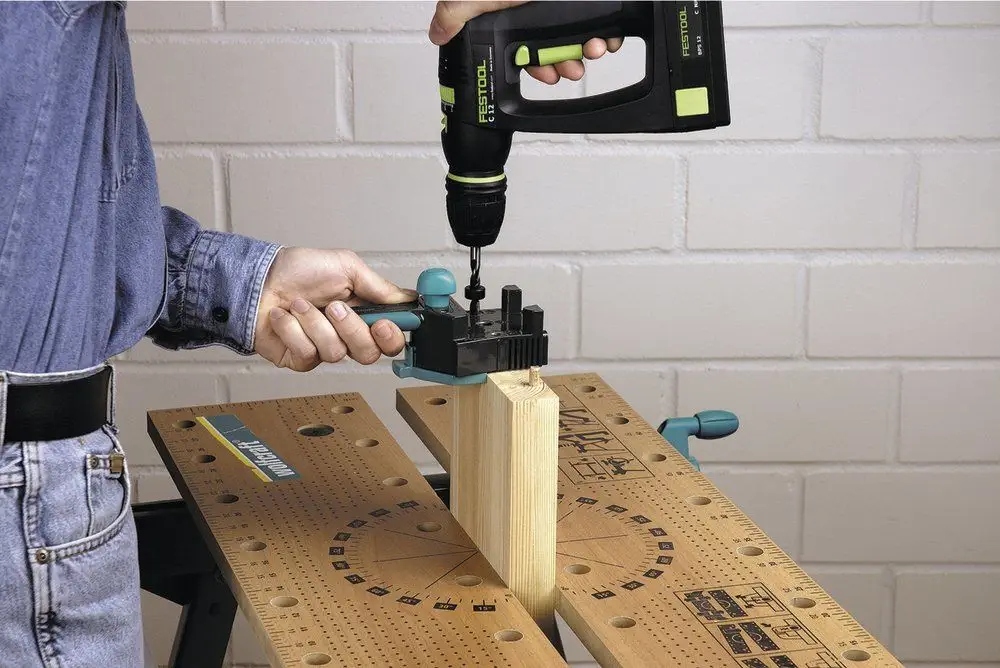 В случае угловых соединений сначала сделайте все передние отверстия, как описано выше. Прикрепляем дюбеля в передние отверстия на клей, а затем устанавливаем по этим дюбелям упор дюбеля. Для этого вставляем штифт в соответствующую втулку сверла, устанавливаем упор сбоку доски и фиксируем положение с помощью регулировочного винта. Теперь поместите лицевую панель на доску без отверстий. Штифт войдет в направляющую канавку инструмента. Когда упор окажется у нижнего края доски, можно начинать сверление.