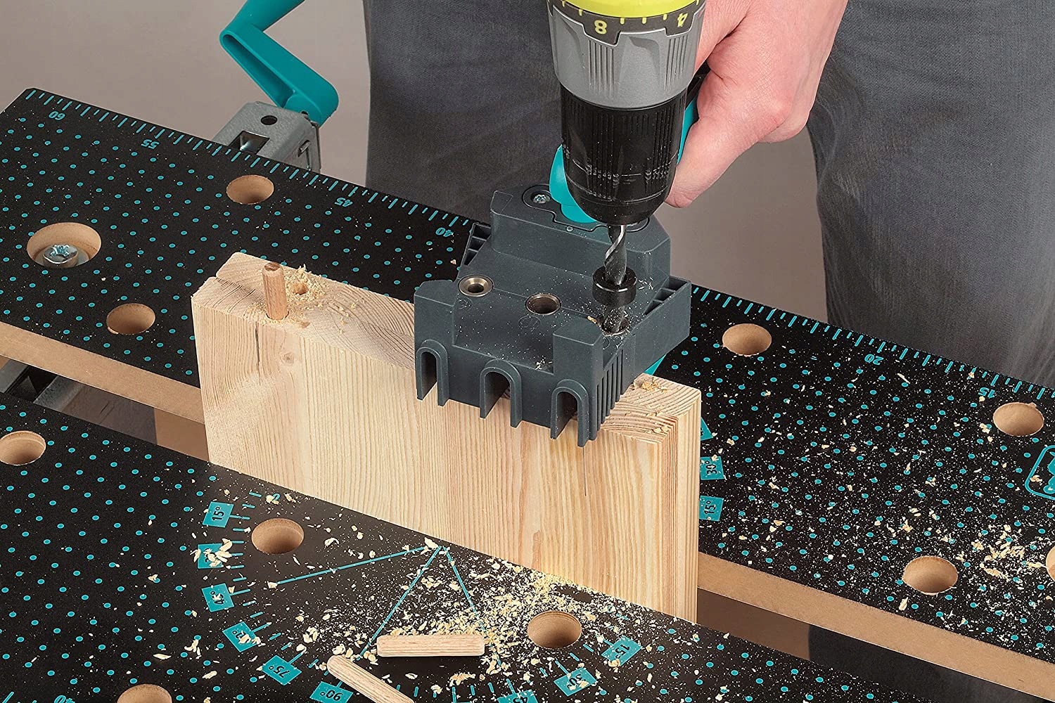 - Набор включает в себя устройство для быстрых соединений в дюбеле, деревянные дюбели, дровяные упражнения, теги, ограничения глубины и деревянные клей