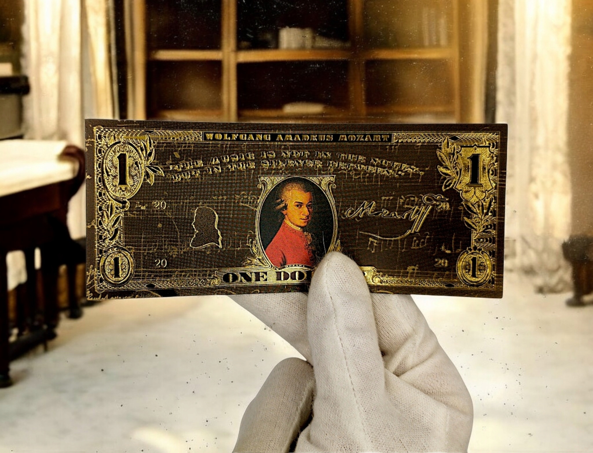 Если вы любите классику, искусство и элегантность, эта причудливая банкнота с Вольфгангом Амадеусом Моцартом создана для вас! ✨ h2> Золотой черный дизайн, богатые украшения и цитата Music Master делают его не только красивым предметом коллекционера, но и уникальным подарком для каждого поклонника классической музыки