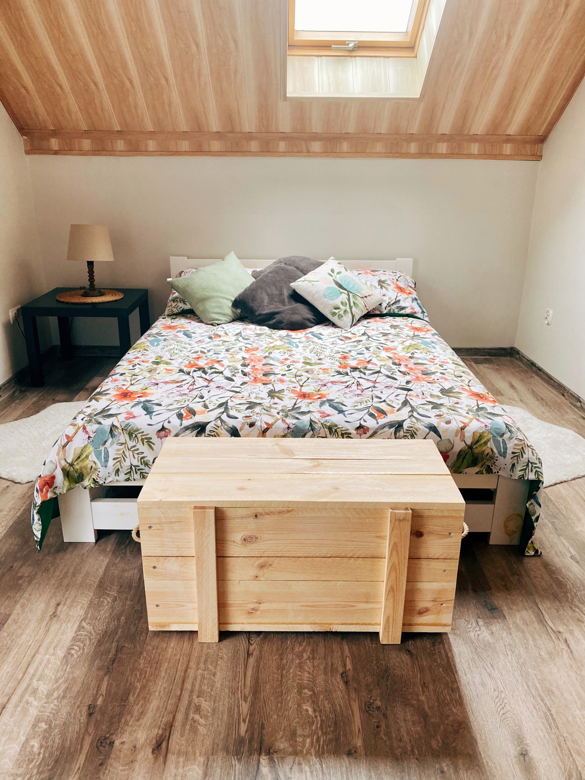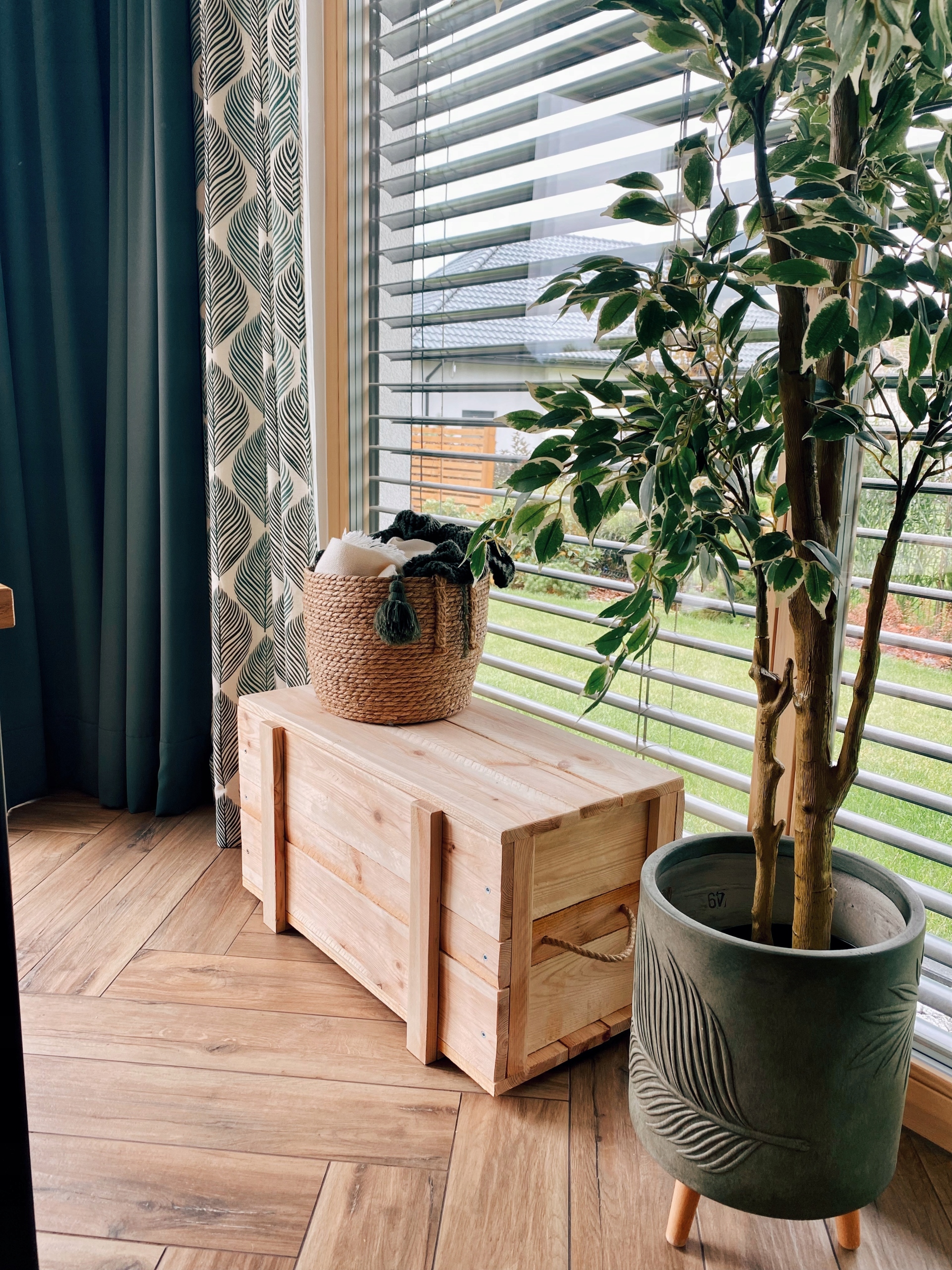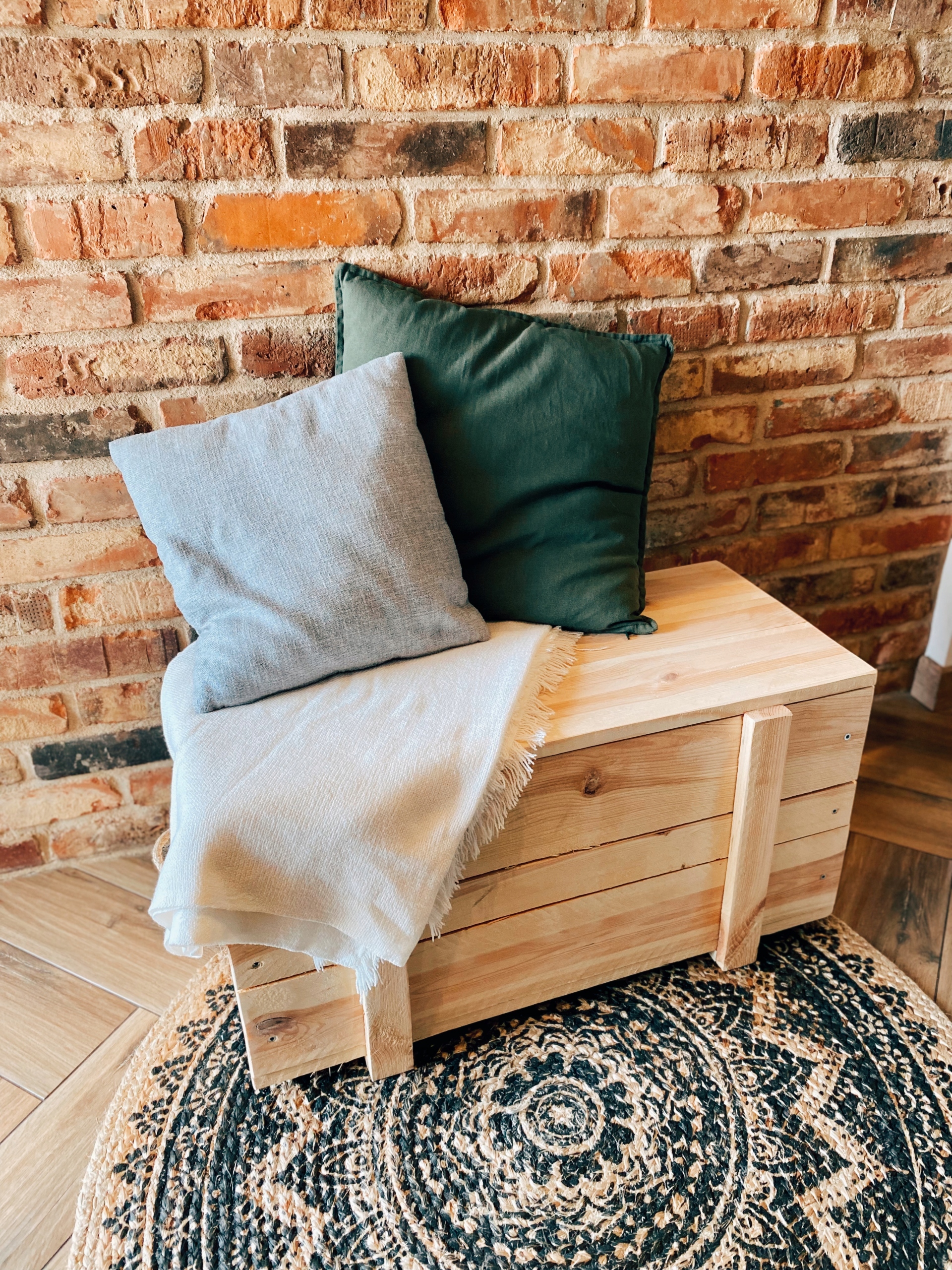Коробка передач изготовлена из натуральной сосны (без лака) - по бокам есть ручки для легкой передачи продукта. Он идеально подходит для хранения всех видов вещей (например, игрушек, постельных принадлежностей). Его также можно использовать в качестве места или стола. Он выглядит красиво как в интерьерах комнат (например, спальни или гостиной), так и на улице (например, терраса, балкон).