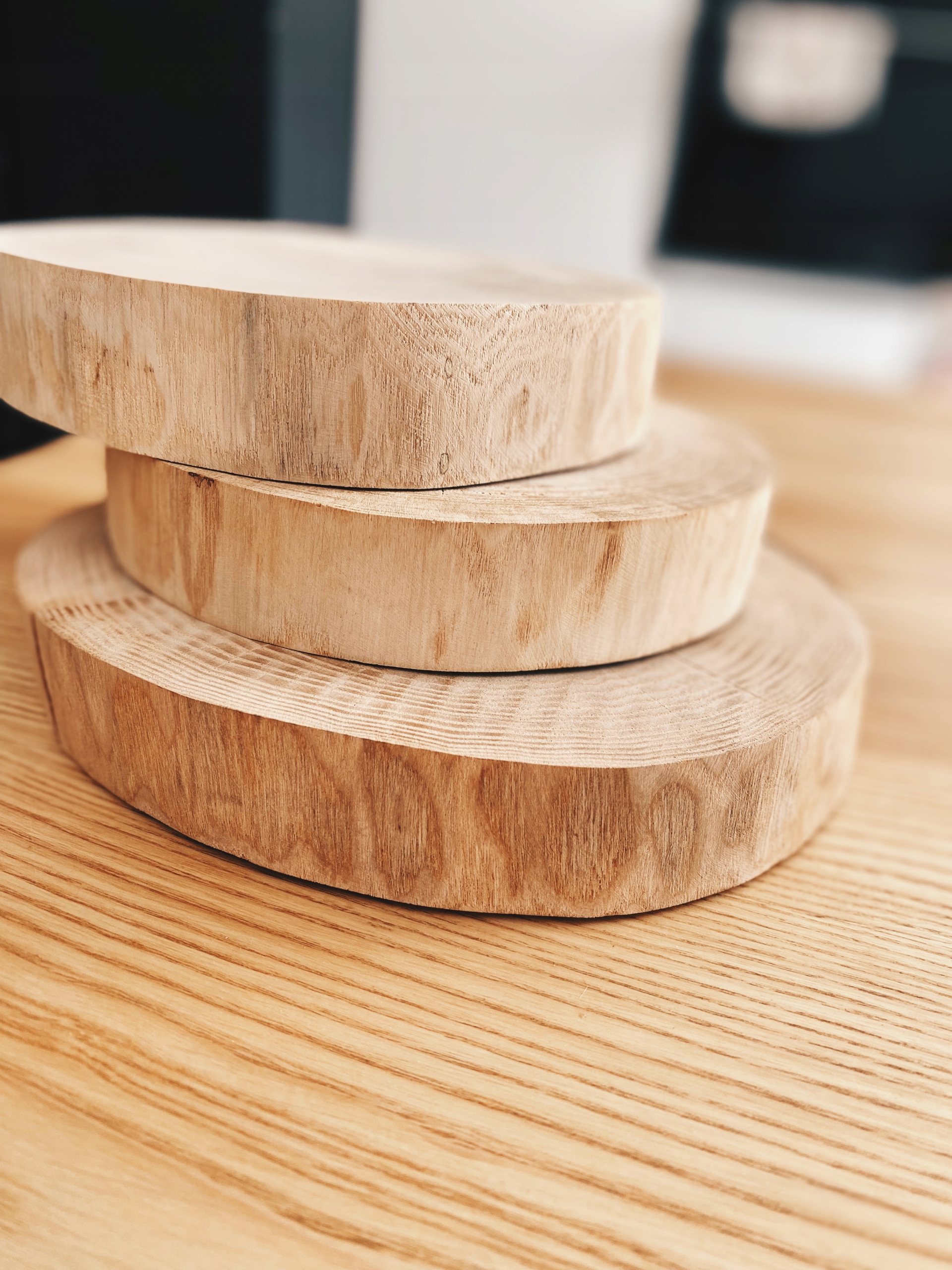 Модно, стильно, ручная работа и неповторимо. Это необыкновенное украшение из кусочков дерева (без лакировки). Их природное очарование позволяет использовать их практически в любой обстановке. Их можно использовать не только как элемент декора дома, но и, среди прочего, в свадебном оформлении. В комплект входят три детали (диаметром 20-24 см), перевязанные джутовой верёвкой.