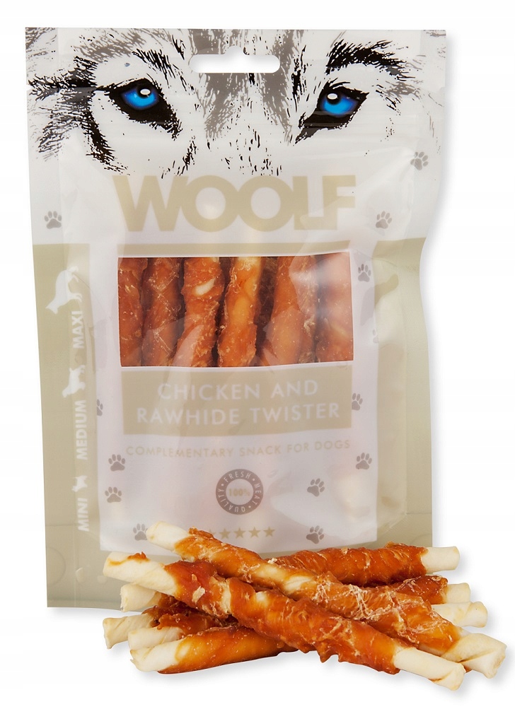 Woolf Chicken and Rawhide Twister — натуральное лакомство для собак с очень высоким содержанием мяса в форме палочки, обернутой куриным мясом. Идеально подходит в качестве закуски, награды и угощения для тренировок. Не содержит химических добавок, красителей и консервантов.