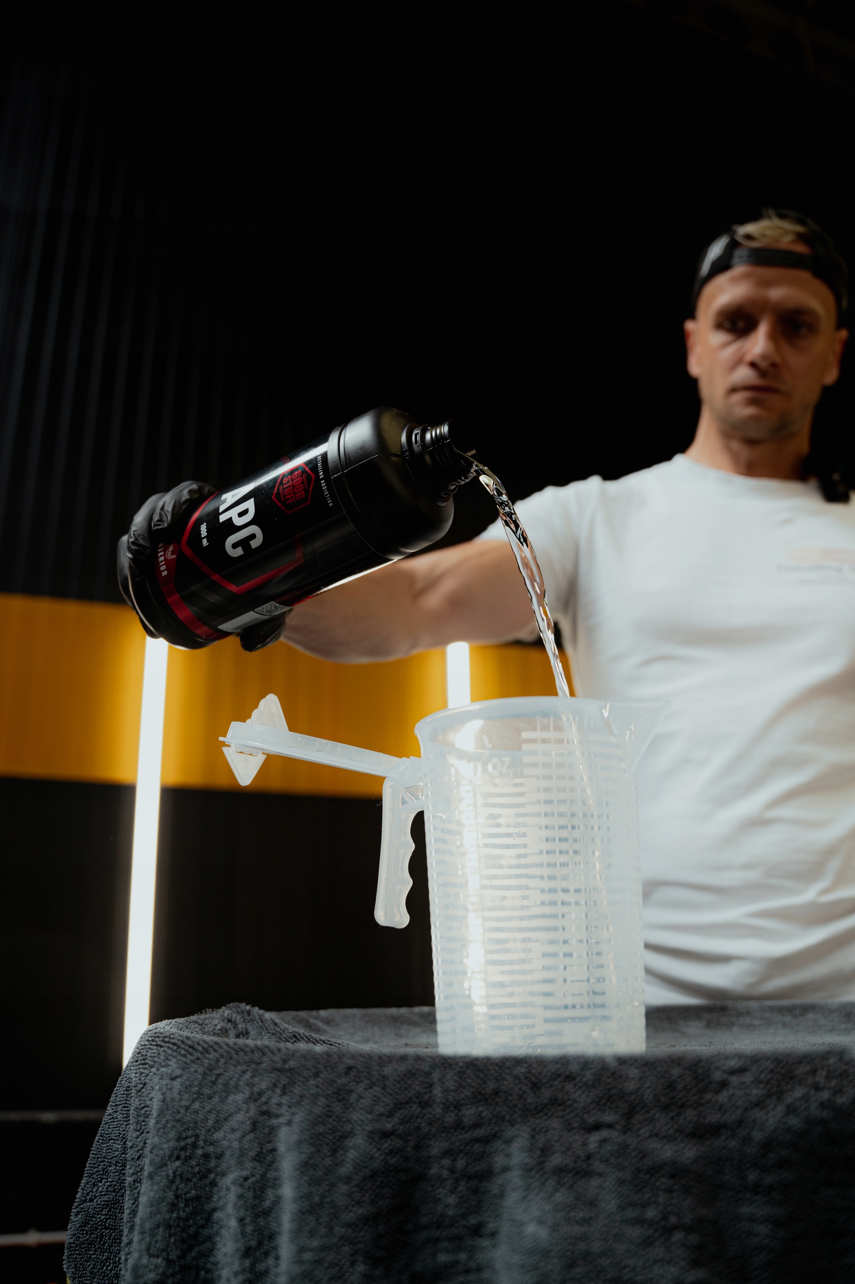 Идеально для смешивания и измерения жидкостей/химикатов для промывки автомобиля. Обеспечивает точное дозирование и избегает загрязнения благодаря встроенному -в ситечке. Сит облегчает использование измерительной чашки.