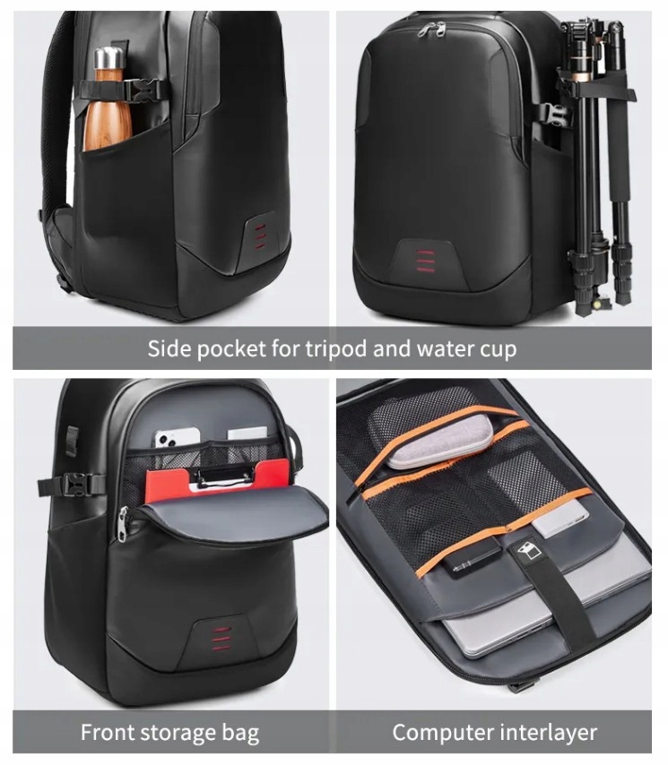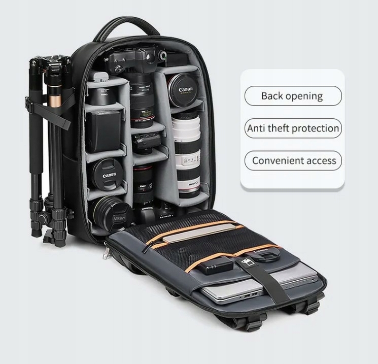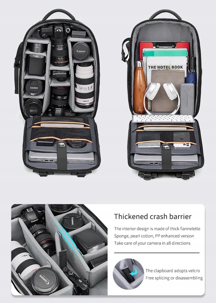 Фотографический рюкзак для ноутбука от Outwalk с символом 6166, в который помещаются две камеры с объективами, лампа-вспышка, дополнительные объективы и ноутбук до 17,3. Рюкзак изготовлен из водонепроницаемых и прочных материалов - нейлона и ПВХ. В переднем кармане рюкзака есть два сетчатых кармана и много места, например, для папок. По бокам рюкзака имеются эластичные карманы и ремень для крепления штатива, который можно прикрепить к любой стороне рюкзака. Основное отделение рюкзака обложено мягкими губками и имеет регулируемые отделения для безопасного хранения фототехники. Предусмотрено место для упаковки фотоаппаратов, объективов, фонарей, мягкий карман для ноутбука размером до 17,3 дюйма, застегивающийся на эластичный ремень на липучке, и три сетчатых кармана для аксессуаров, в том числе один на молнии. Лямки рюкзака и спинка эргономичной формы. Стенки рюкзака отделаны эластичными губками, что обеспечивает удобство ношения в течение длительного времени. На одном плечевом ремне имеется небольшой карман для визитки или удостоверения личности. Рюкзак также имеет нагрудный ремень, который можно носить. используется для крепления плечевых лямок для лучшего распределения веса при полной упаковке рюкзака. На задней стенке рюкзака имеется ремень, позволяющий надеть рюкзак на ручку полетной сумки. Рюкзак. имеет прочную ручку для переноски рюкзака в руках и две лямки с прочными пряжками для усиления крепления рюкзака и защиты вещей от выпадения в случае неожиданного расстегивания молний. Верх рюкзака имеет дополнительные застежки на лямках, с помощью которых можно прикрепить, например, дополнительный штатив.