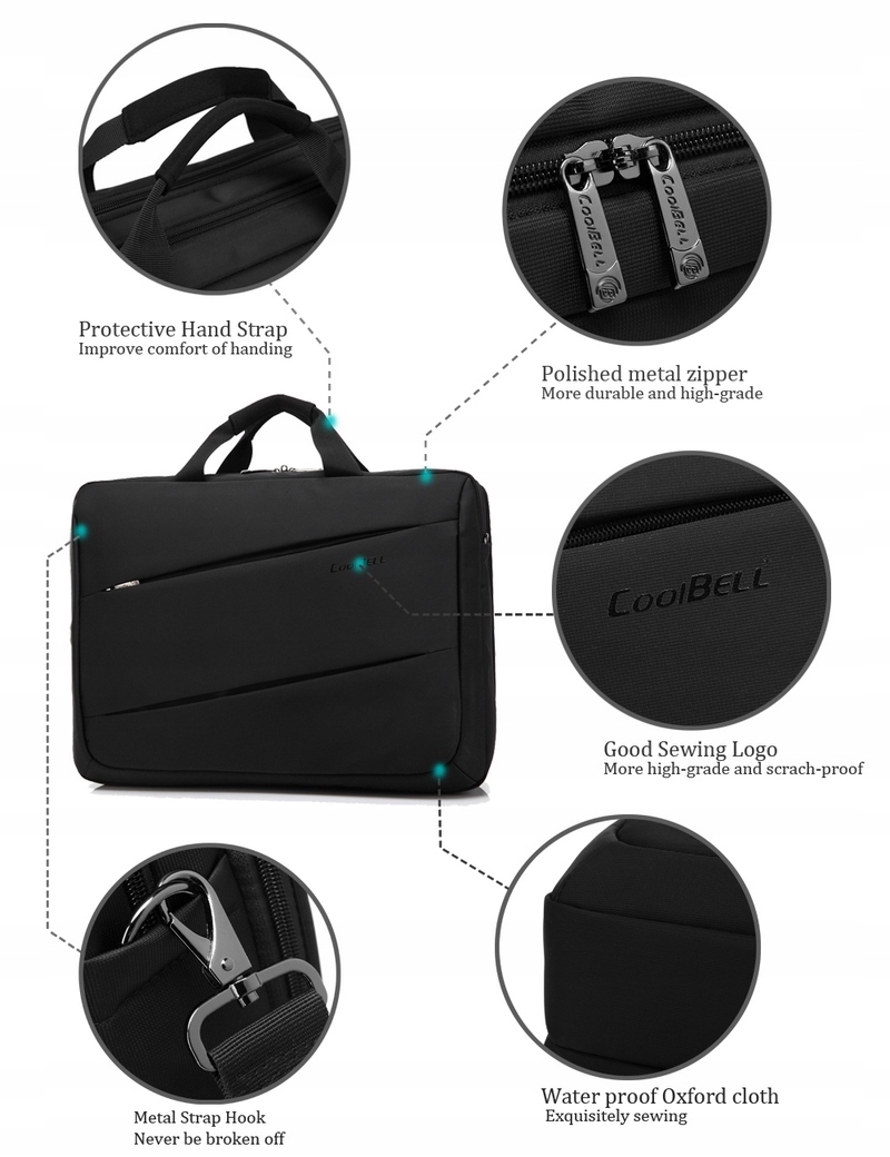 Сумка для ноутбука до 17,3" марки COOLBELL с символомCB-2068 . Очень качественно сделанная и продуманная сумка для ноутбука с минималистичным дизайном. Изготовлена из прочного и водонепроницаемого материала - ОКСФОРД. Имеет два отделения и несколько полезных карманов. в котором можно разместить все необходимые вещи.В одном отделении имеется застегивающийся на липучку карман для ноутбука до 17,3 и карманы для телефона, кошелька или ручек.Карман для ноутбука на подкладке из специальной ткани. пенопласт, но лучше беречь устройство от ударов и ударов. Во втором отделении два отделения и много места для папок, документов и даже одежды. Оба отделения застегиваются на прочные двойные металлические молнии.Снаружи в передней части сумки расположены два кармана на молнии для полезных вещей или документов.Сумку можно носить на плече (ремень подвешивается на прочном металлическом карабине) или в руке (двойная прочная ручка удобно лежит в руке). На задней стенке сумки пришит широкий ремень, благодаря которому сумку можно устойчиво разместить на ручке полетной сумки. Мы рекомендуем сумку/рюкзак COOLBELL CB-2068 особенно людям из делового мира, они простые и элегантные.