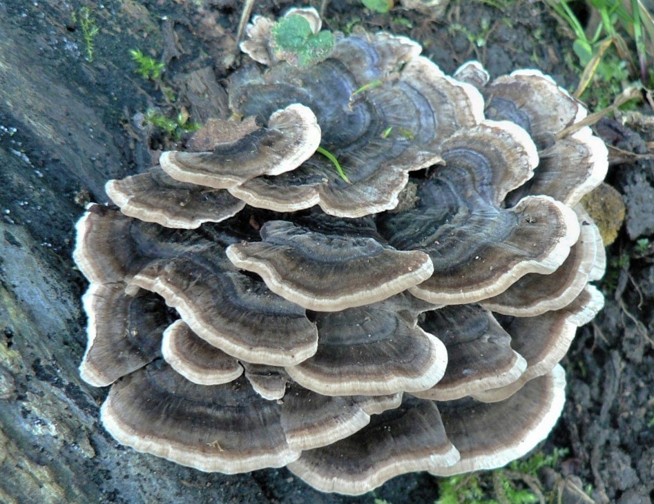 ✅Вросняк разноцветный (Trametes versicolor) — древесный гриб из семейства Polyporaceae, широко распространенный в Польше, за исключением гор. Его можно найти в более крупных скоплениях, а соседние плодовые тела перекрываются черепицей. Он растет на мертвых или умирающих деревьях. Его иногда называют «индюшиным хвостом», что очень точно описывает его внешний вид.