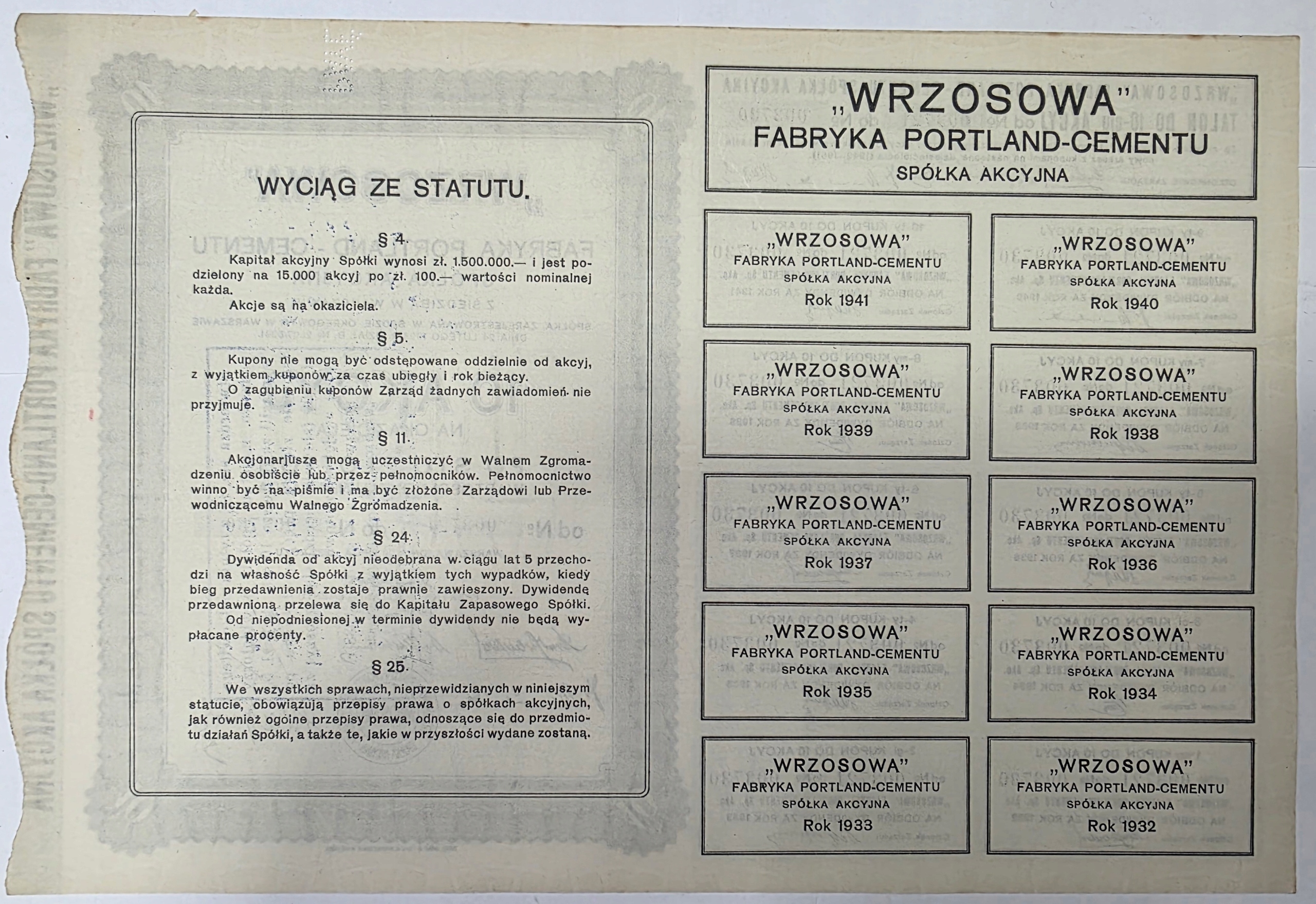 Уникальный, редкий сертификат акций известного цементного завода «Вжосова», расположенного недалеко от Ченстоховы, - одного из небольших, но процветающих предприятий строительной отрасли Второй Польской Республики.