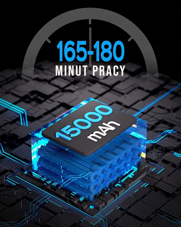 Длительное время работы 180 минут. Благодаря огромной емкости 15000 мАч и использованию безопасного литий-полимерного аккумуляторного модуля большой емкости, который более компактен и имеет большую емкость, он превосходит традиционные литиевые батареи. с точки зрения ионной безопасности.