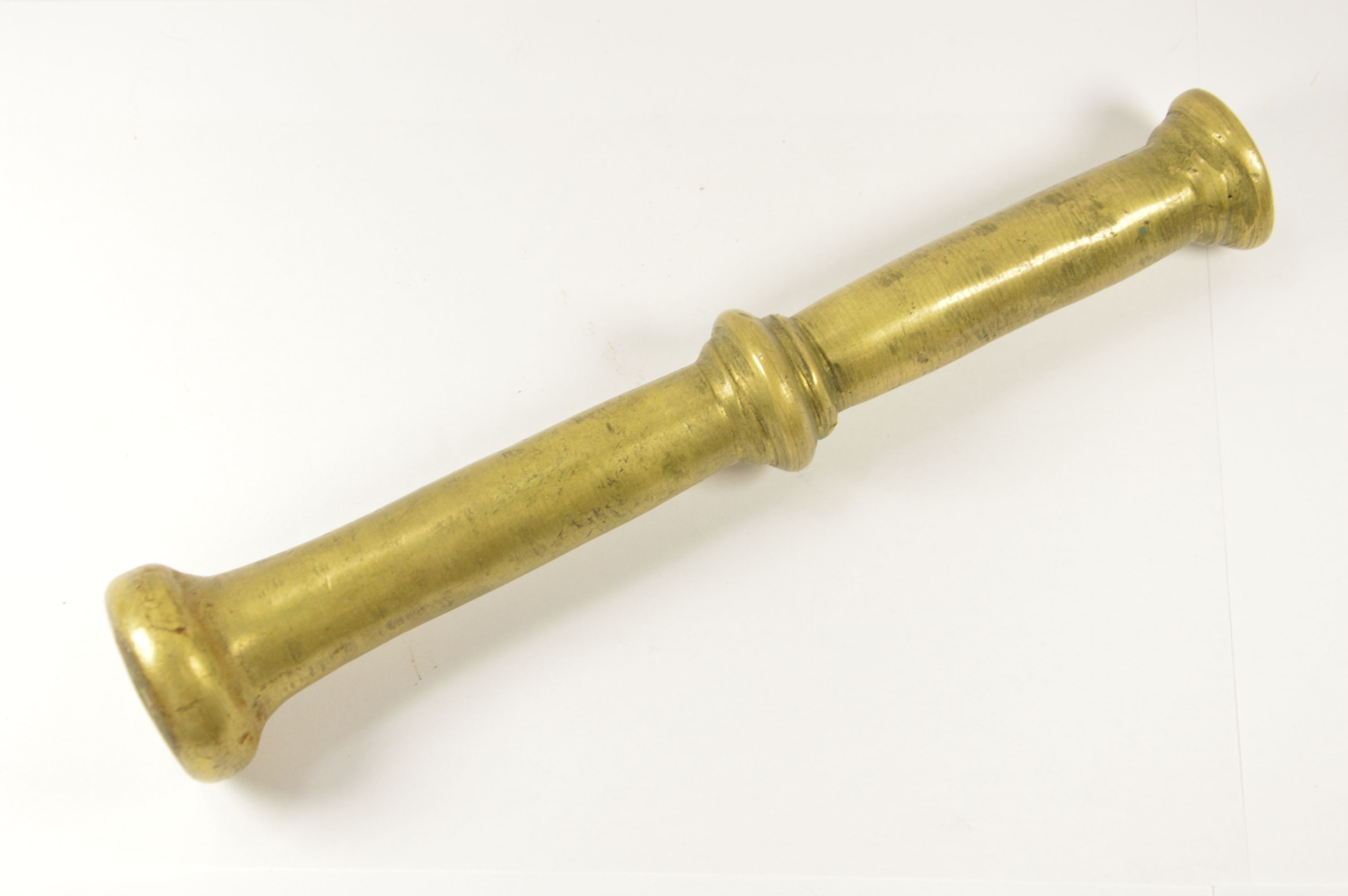 Оригинальная, довоенная, латунная ступка. Интересная, необычная форма, дополнительное ушко для подвешивания. В набор входит большой латунный пестик.