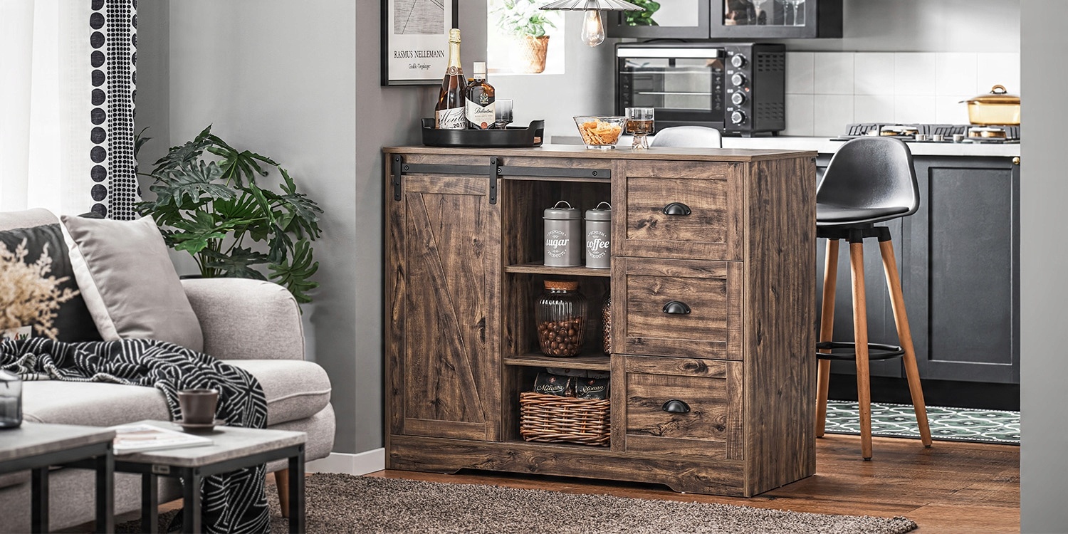 Этот кухонный остров имеет дополнительное удлинение и столешницу из каучукового дерева. Их также можно использовать в качестве уникального барного стола.