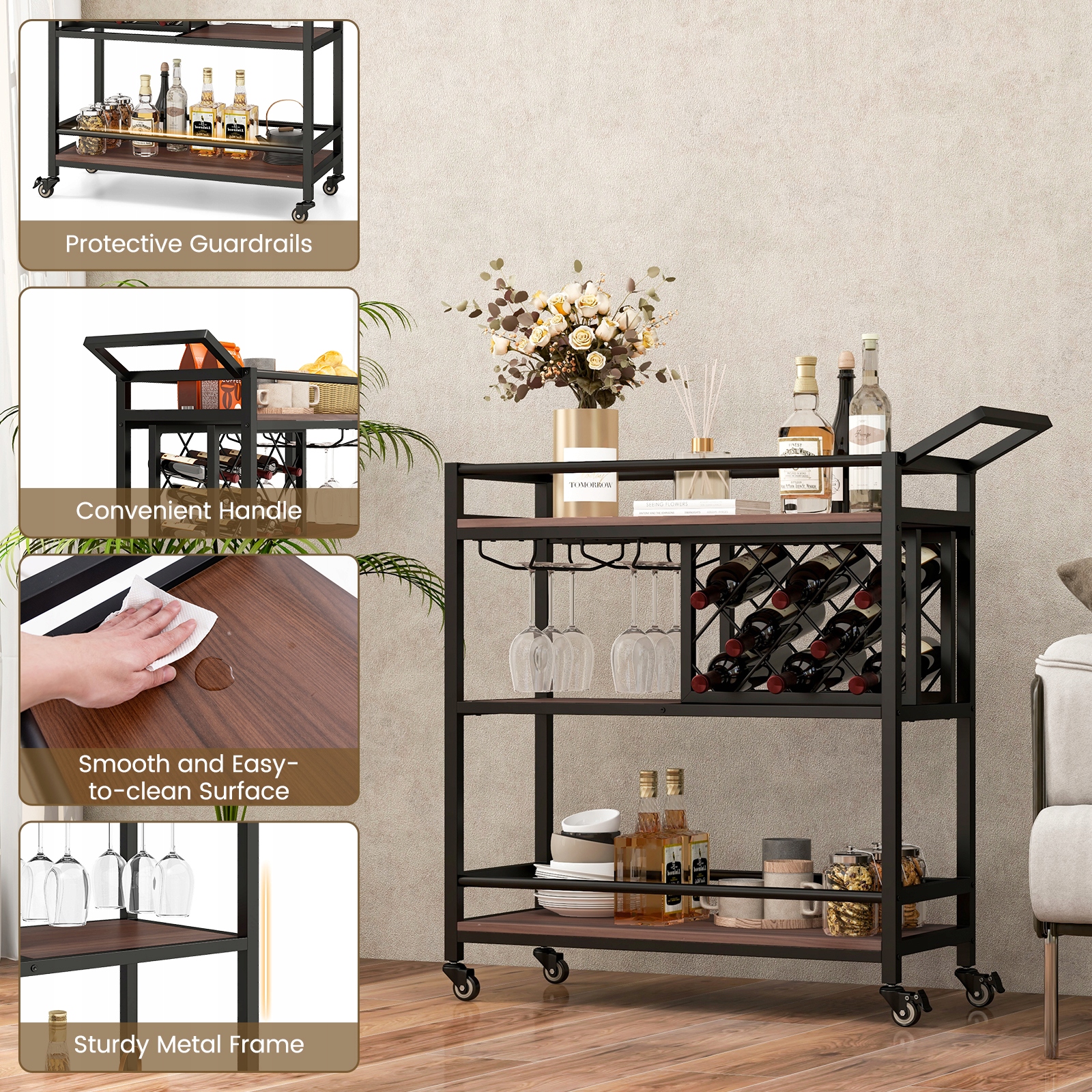 Тележка для бара имеет несколько вариантов хранения, включая стойки для вина и держатели для стаканов, а также трехъярусную полку для хранения. Здесь могут разместиться 8 контейнеров для вина, от 4 до 5 бокалов и другие необходимые предметы.